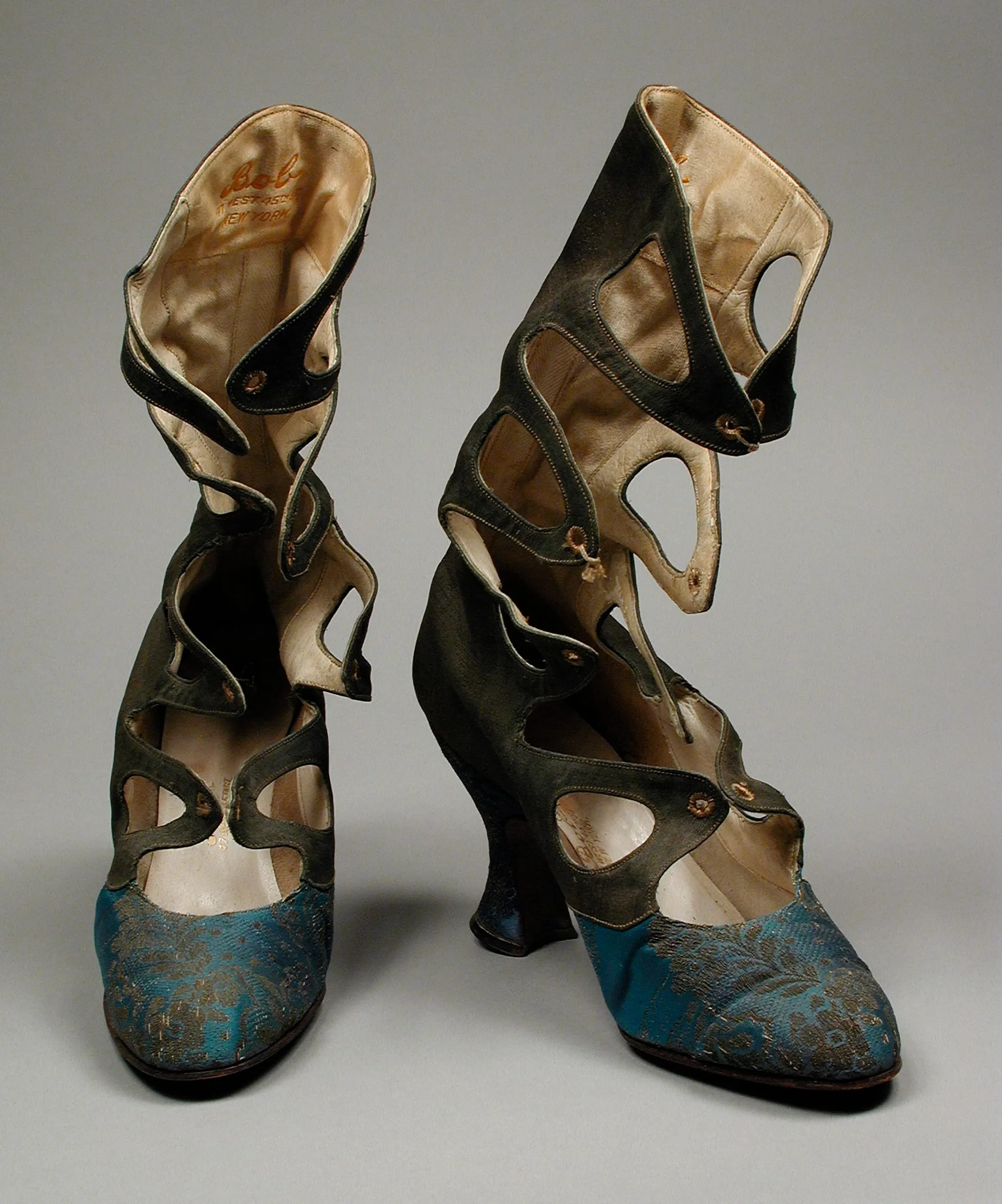 - Silk satin with metallic-thread supplementary weft patterning, metallic-thread twill (lamé), and leather