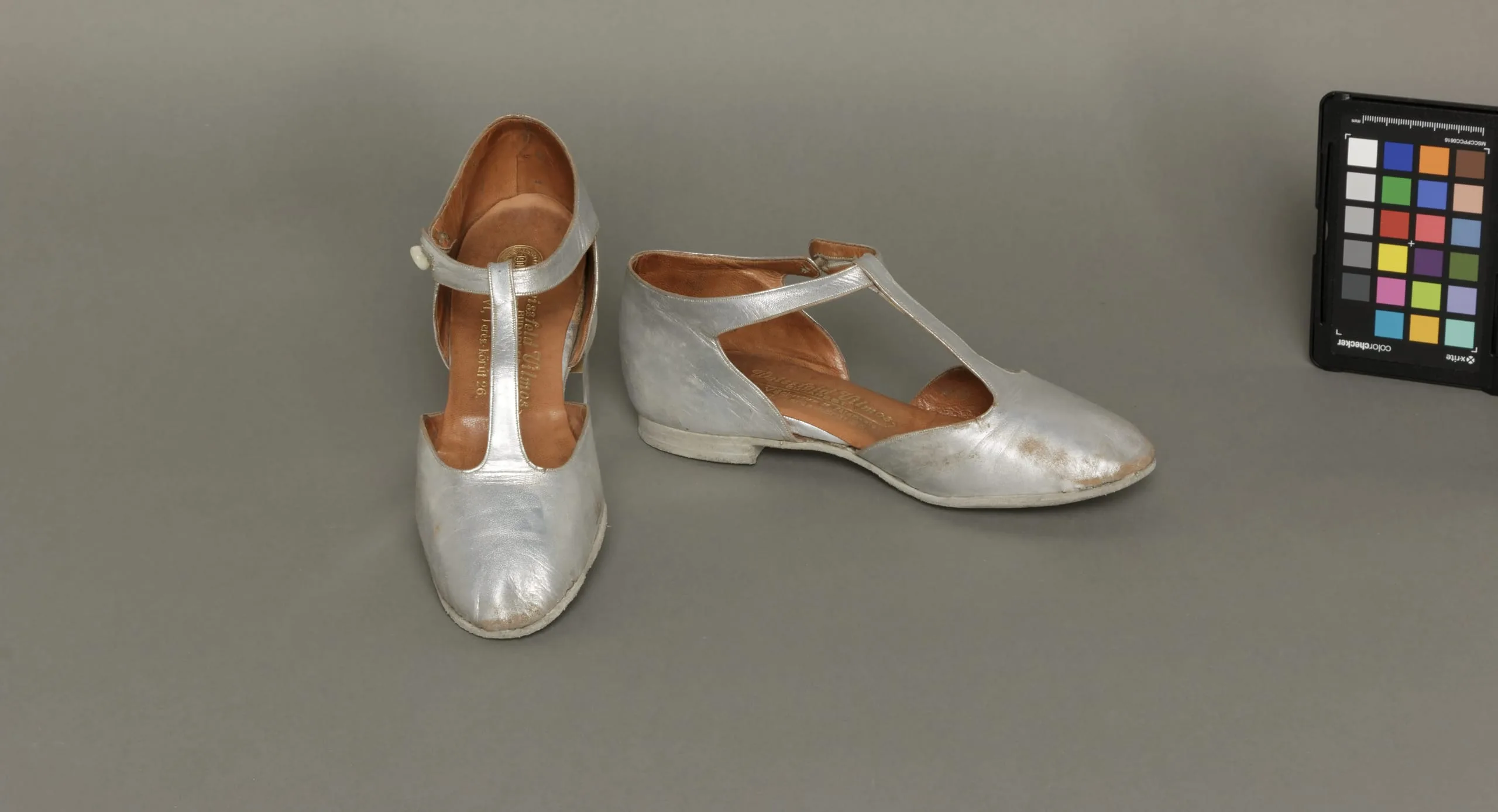 Pair of silver metallic T-strap women's shoes with low block heels and caramel tan leather lining, one upright and one on its side