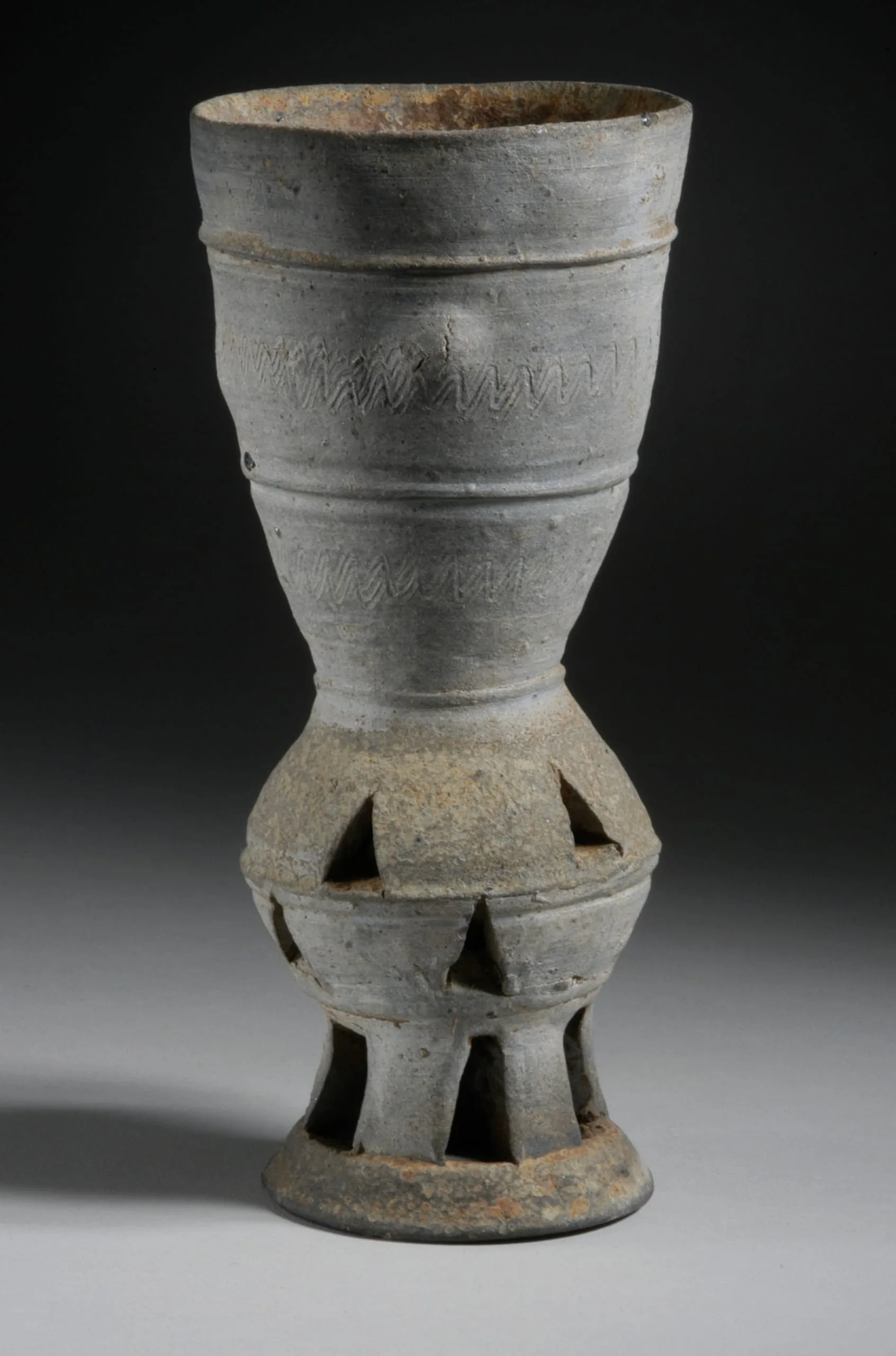 - Wheel-thrown stoneware with impressed, combed, and cut decoration and ash and lead glazes