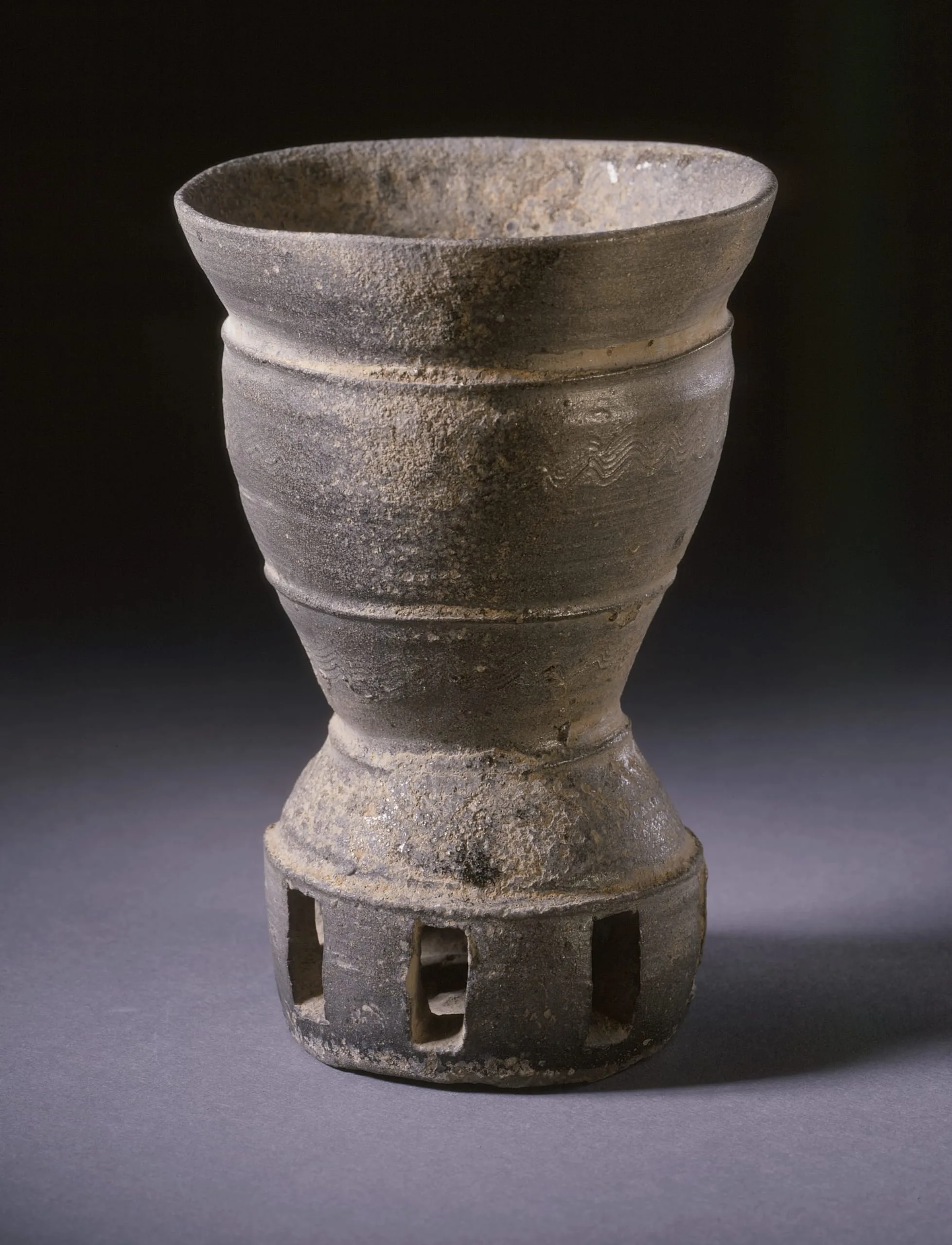 - Wheel-thrown stoneware with impressed, combed, and cut decoration and ash and lead glazes