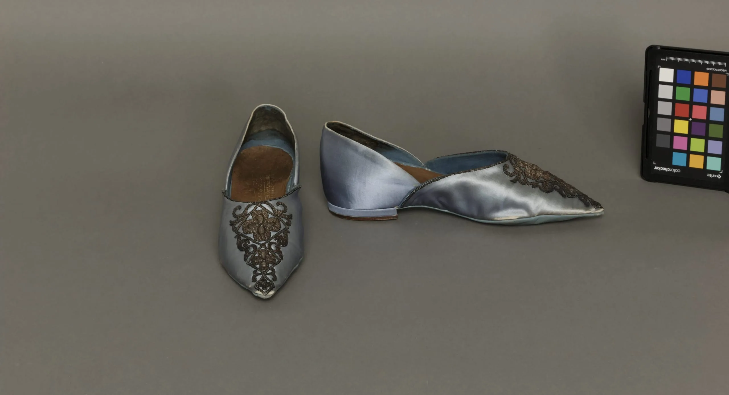 Pair of flat silver-blue satin slippers with pointed toes and dark metallic embroidered ornaments, one upright and one on its side