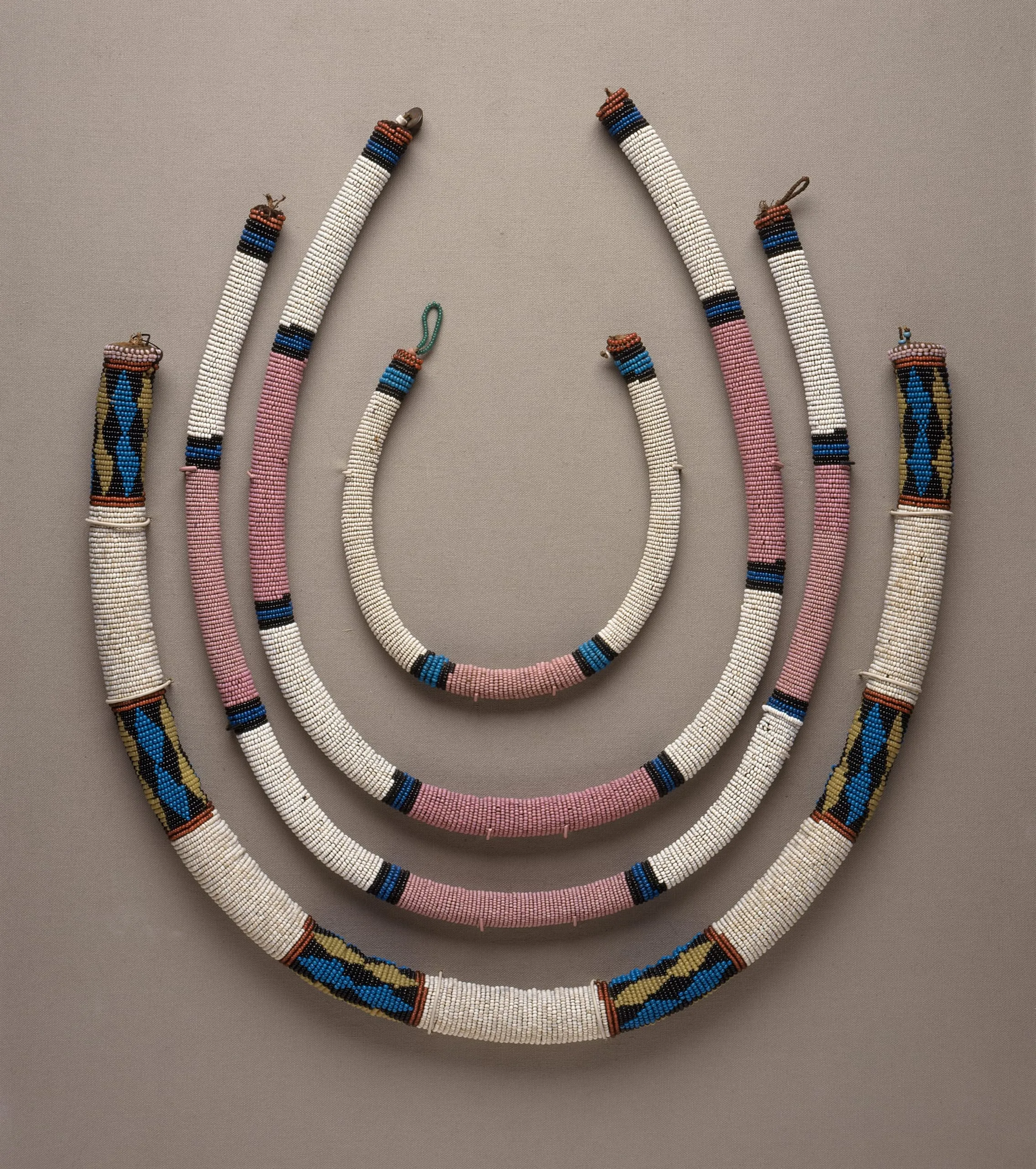 - a) Necklace: 16 x 3/4 in. (40.64 x 1.91 cm); b) Belt: 22 x 3/4 in. (55.88 x 1.91 cm); c) Belt: 32 1/4 x 3/4 in. (81.92 x 1.91 cm)