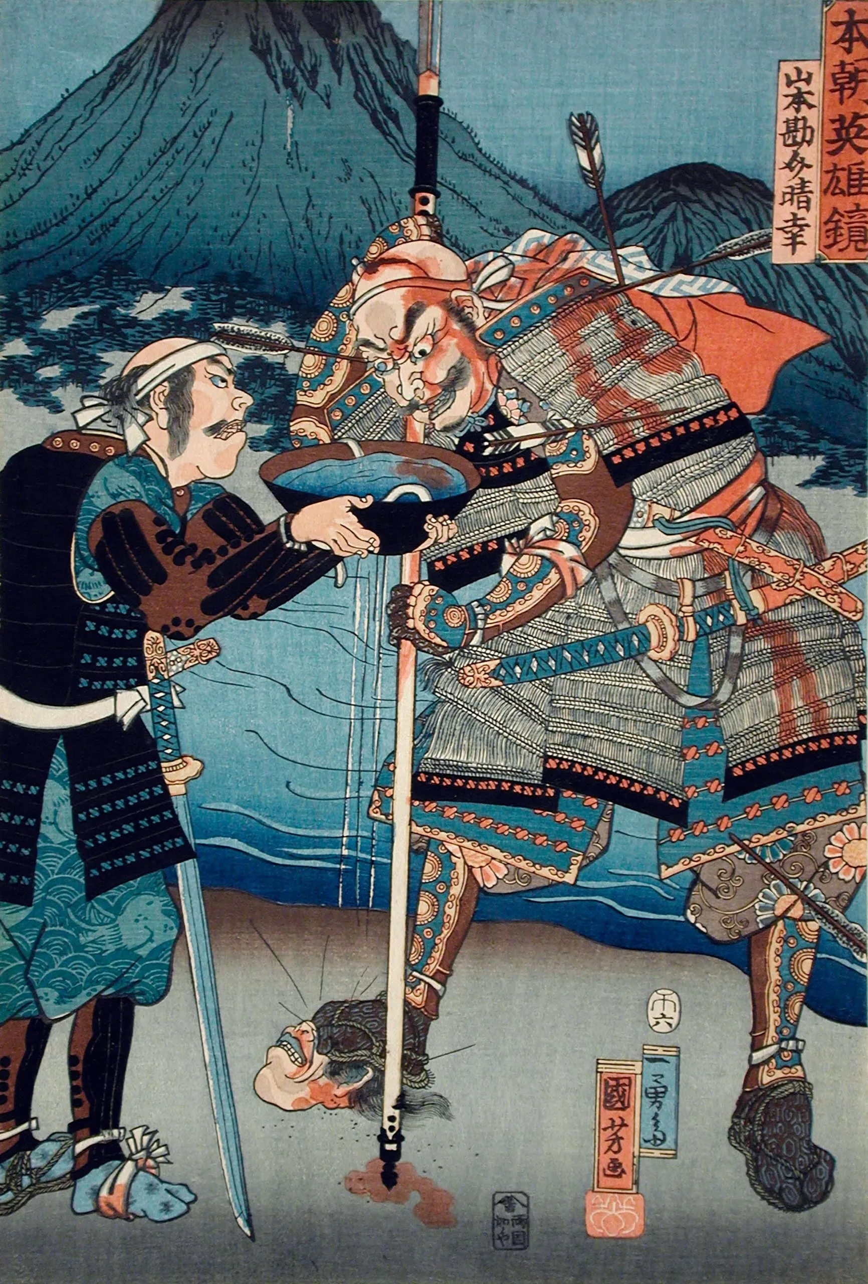 After his battle strategy failed, General Yamamoto Haruyuki is said to have taken up a yari spear and rushed into battle to regain his honor. Here the general is pictured standing atop of the head of a defeated enemy after retreating from battle. Haruyuki's elaborate armor is pierced with arrows and blood flows from his wounds. He leans against his yari spear as a second warrior offers him a bowl of water. Soon following this, to avoid death at the hands of the enemy, he committs seppuku - ritual suicide. In order to prepare for seppuku, he is said to have retreated from the battlefield to a secluded area such the one depicted in the print.