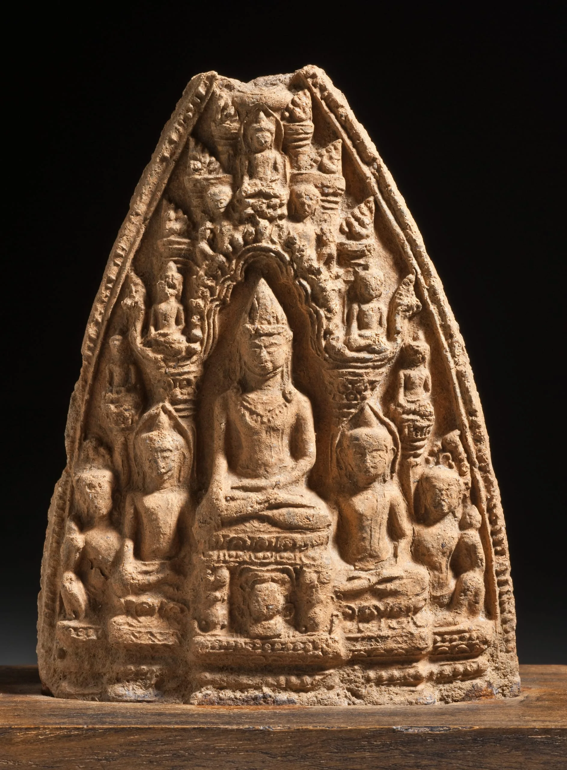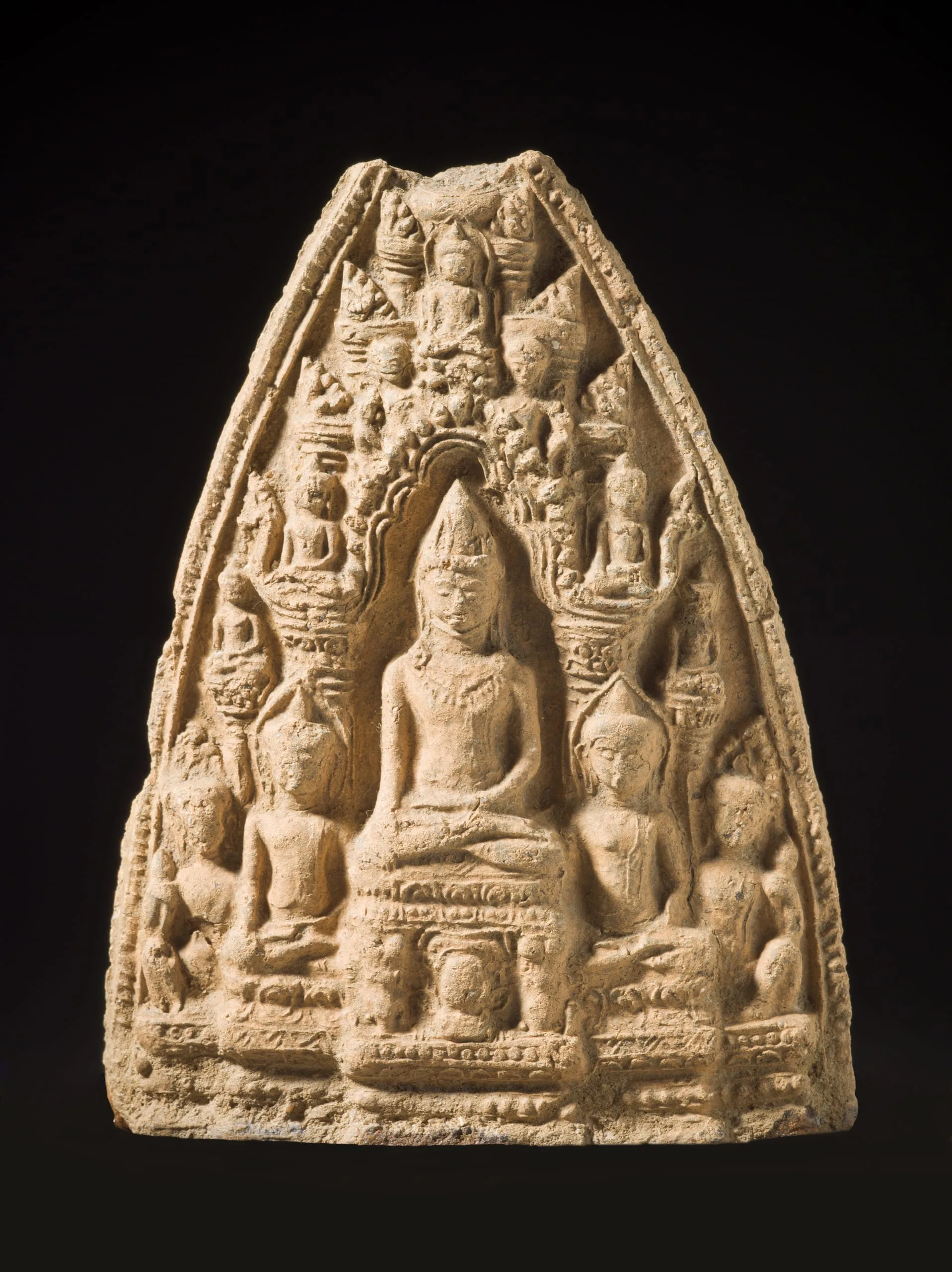 Tan stone relief sculpture with pointed arch form, featuring a large central seated figure flanked by rows of smaller seated figures arranged in tiers