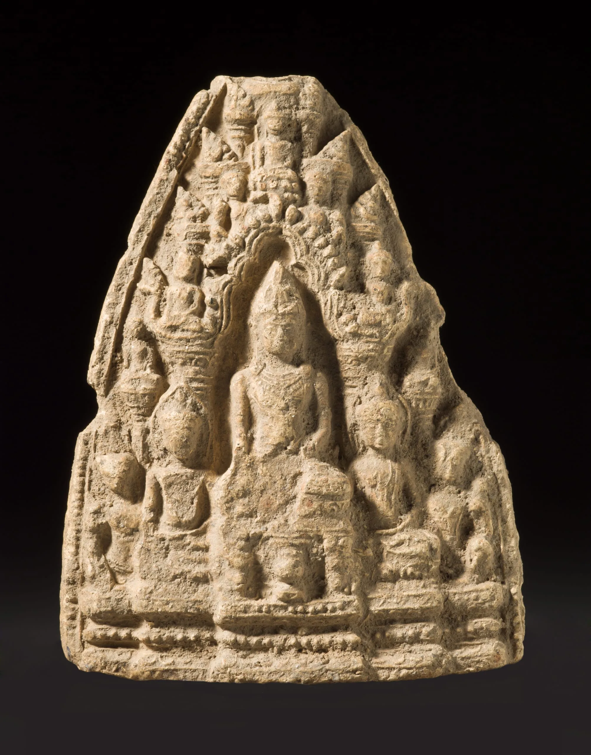 Votive plaque carved in pale beige stone or clay, triangular form with a large central seated crowned figure surrounded by multiple smaller figures in ascending registers