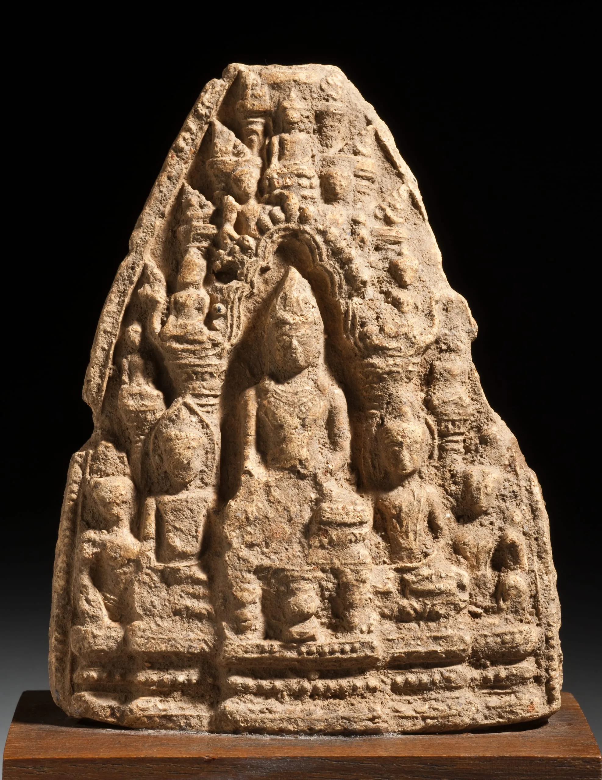 Sandstone votive stele with a triangular form, featuring a central standing crowned deity figure beneath an arched canopy, flanked by smaller attendant figures and seated figures in registers, with weathered surface texture throughout, mounted on a wooden base.