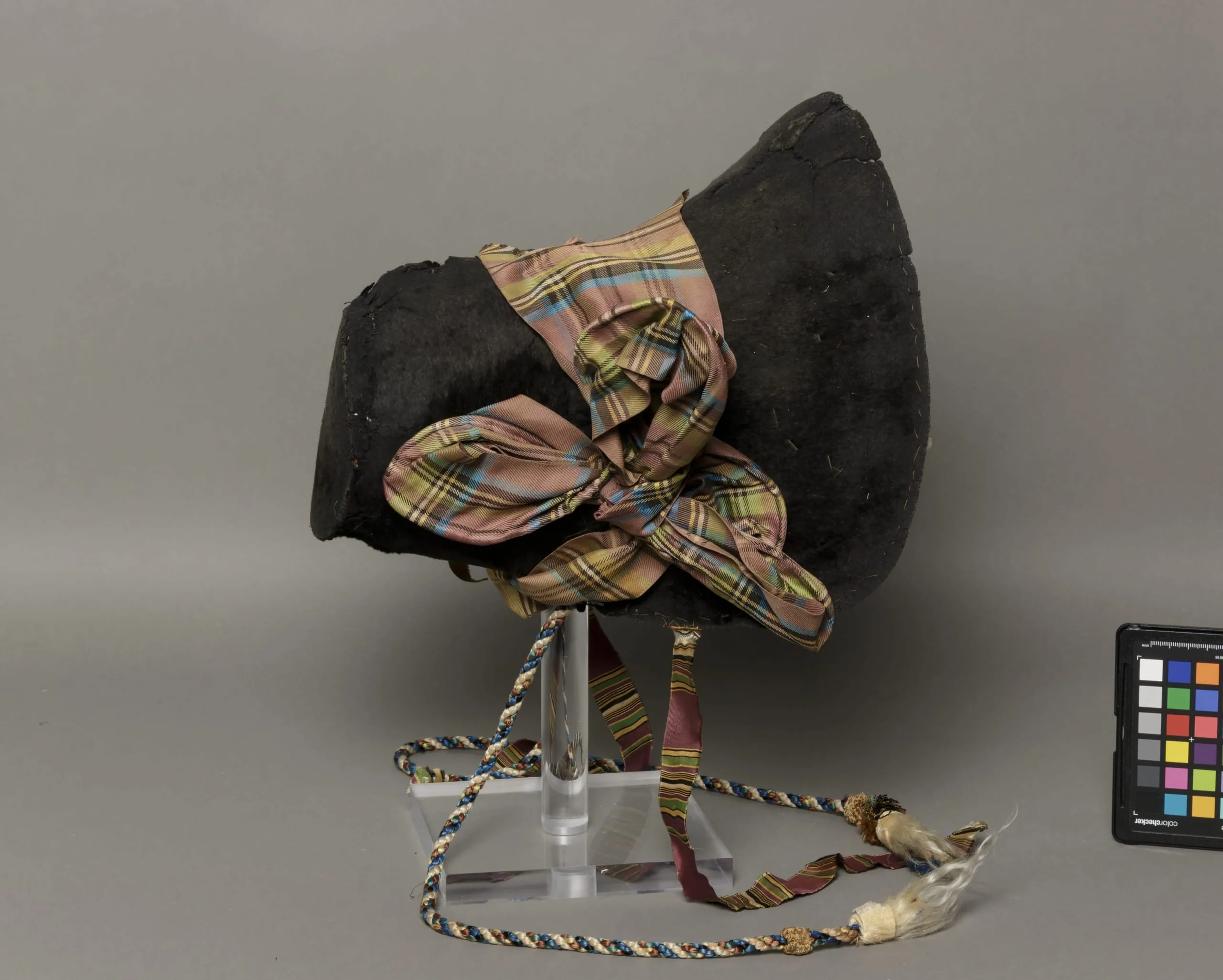 - Beaver fur with silk twill ribbon, cotton and linen plain weave flowers, linen plain weave flowers, silk grosgrain ribbon and silk cord with goat skin and fur tassels