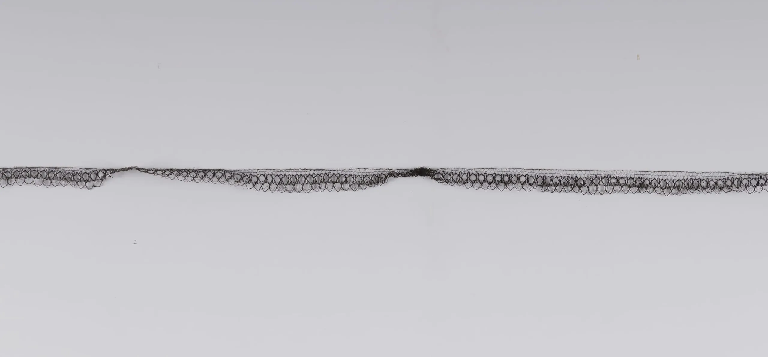 Narrow strip of black lace trim with scalloped picot edging and a diamond-mesh ground, laid flat against a pale gray background
