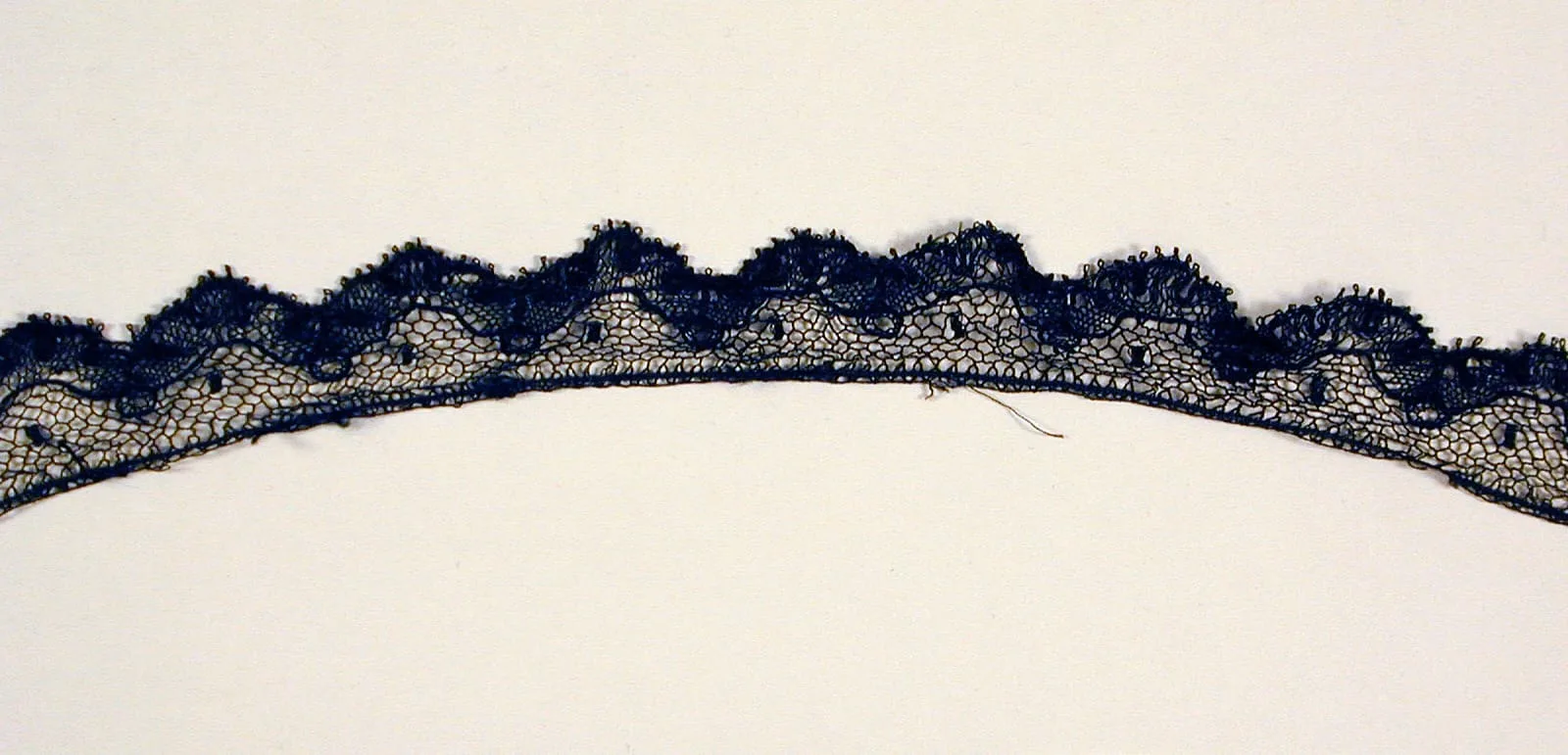 Strip of midnight navy blue lace with scalloped upper edge and mesh ground, arcing gently against an off-white background