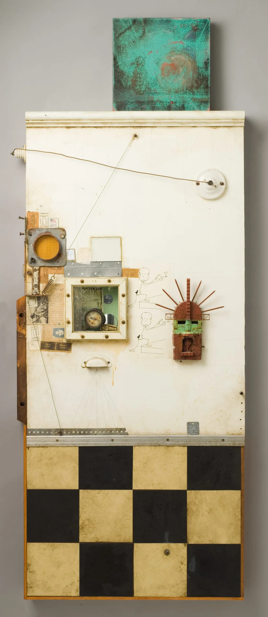 - Wire, postage stamps, wood, linoleum, pencil, screws, glass, paper, newspaper clippings, tickets, credit card fragment, mirrors, metal elements, and pressure gauge on wood panel