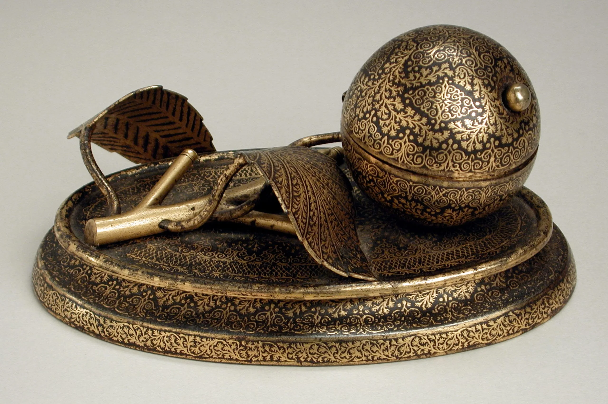 This inkstand’s intricate decoration consists solely of gold wire. The technique involves incising or cross-hatching a design into the iron or mild steel ground with a hard steel needle or liner chisel. Pure gold wire or gold leaf is then hammered into the engraved pattern and the whole object is heated, re-hammered, and polished.