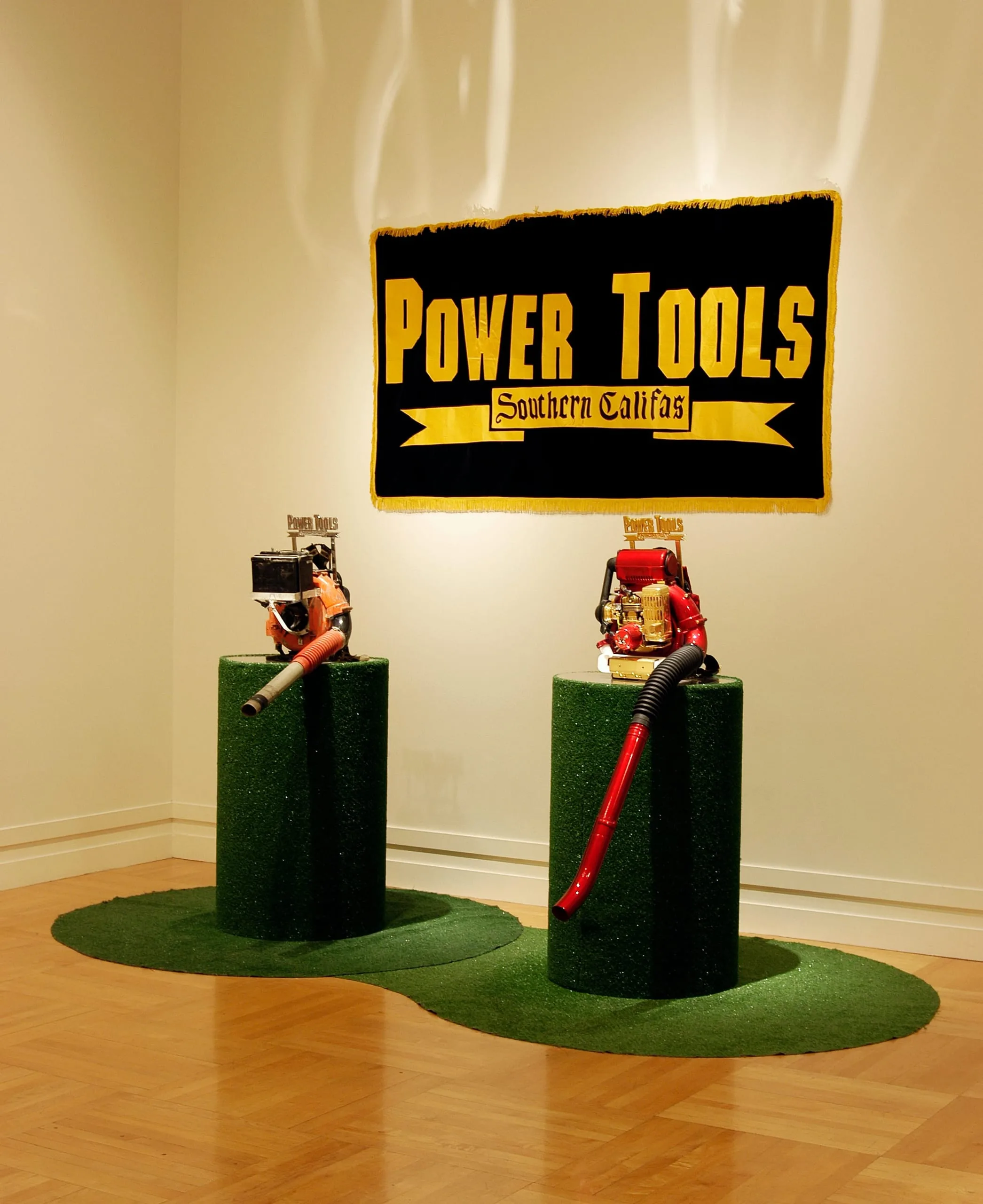- .1) Tool #1: customized leaf-blower machine with electric motor and car battery (by Cody Sanchez) and chromed low-rider bicycle club plaque, displayed on mirror and Astroturf pedestal, on a carpet of Astroturf ringed with cedar chips; .2) Tool #2: customized leaf-blower machine with 24-karat gold-plated engine, velvet, and metal-flake apple candy paint, displayed on mirror and Astroturf pedestal, on a carpet of Astroturf ringed with cedar chips; .3) Banner: synthetic fabric banner