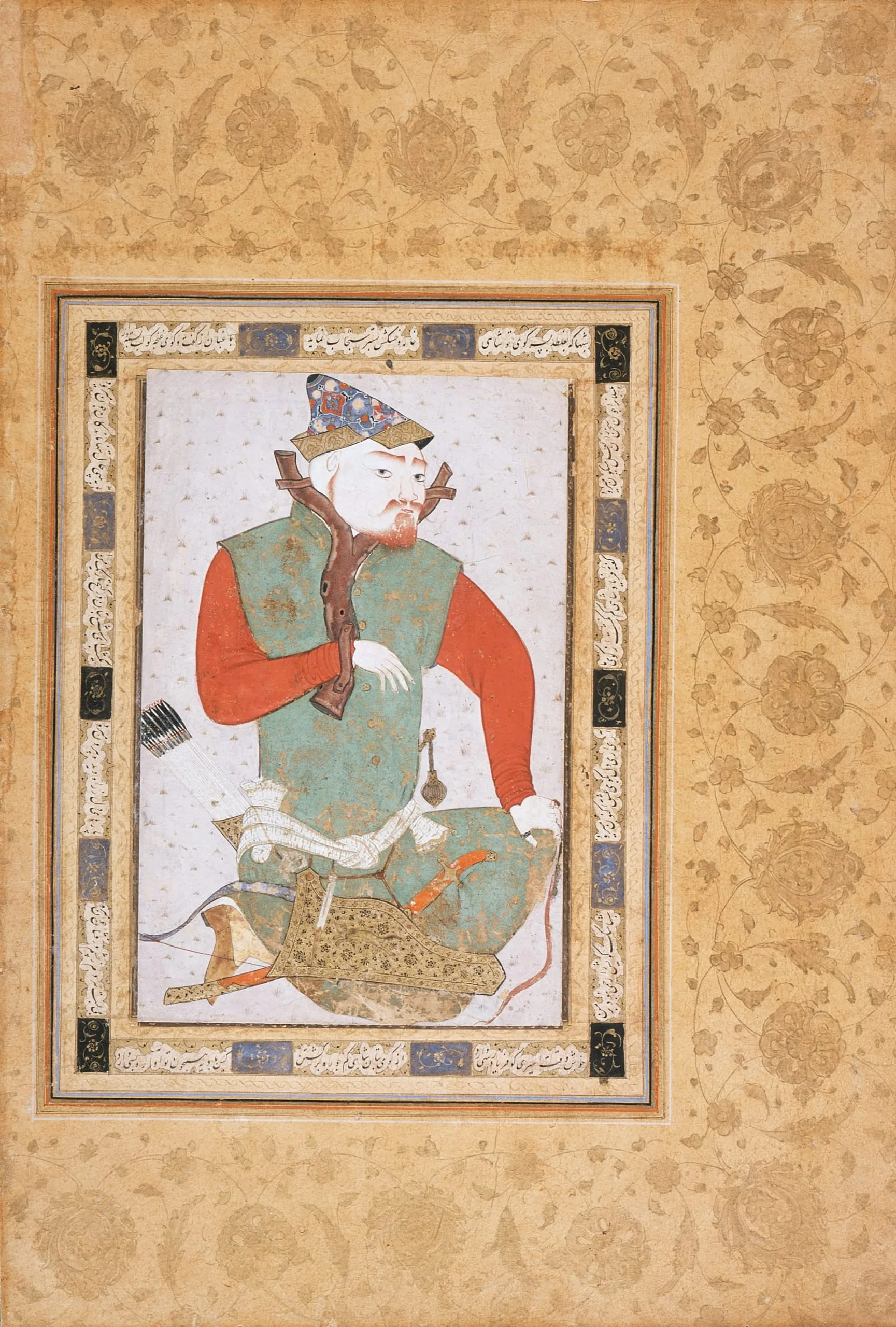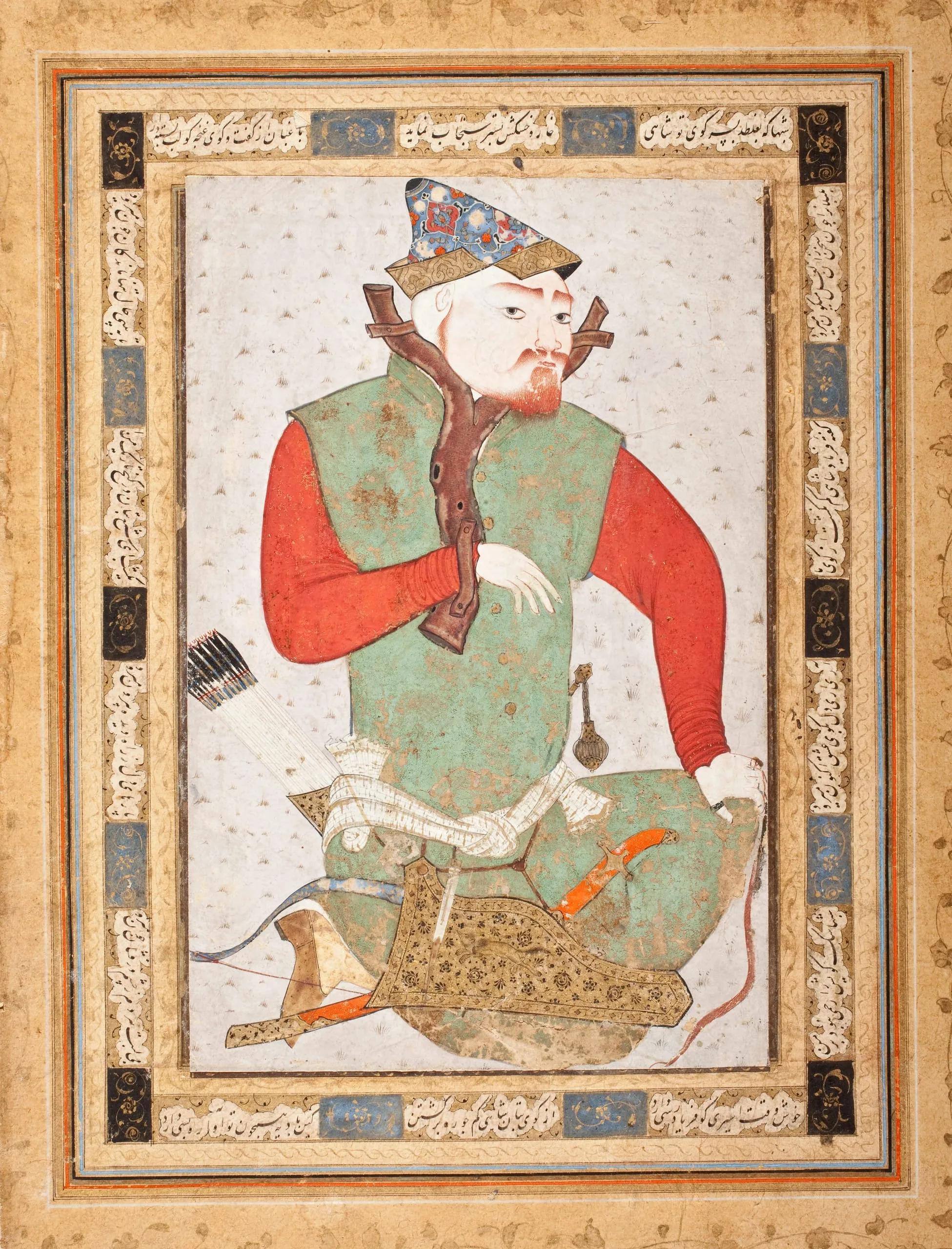 The Turkoman prisoner is a common subject in Iranian art (also see M.85.237.28). The motif was copied and subtly interpreted in both drawings and paintings, which were probably intended for placement in albums. The prisoner depicted here, as in all such representations, is fettered by a palahang, a device made from a forked branch, to which one wrist is attached by an additional band of wood or metal. A crossbar at the back of the prisoner’s neck completes the restraint. Based on the Persian poetry that surrounds the painting, it is possible to suggest a less literal meaning for this imagery. The verses give voice to the torments of unrequited love, a common theme in classical Persian poetry. Claiming to haunt the street of the beloved by night, the lover moans, "Happy is that prisoner who has someone to come to his rescue."