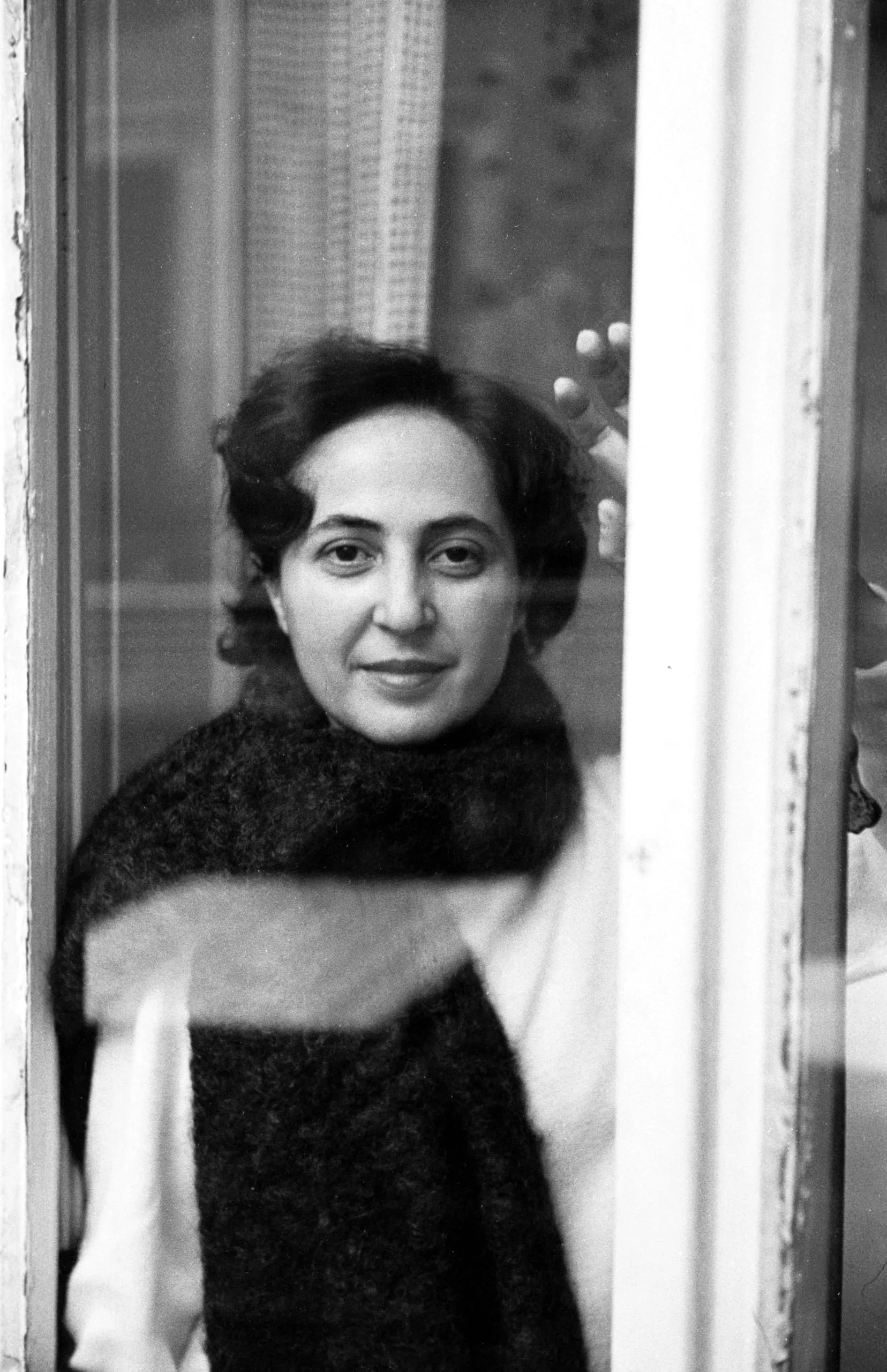 Black and white photograph of a dark-haired woman in a turtleneck sweater, seen through a glass window pane, looking at the camera with a slight smile