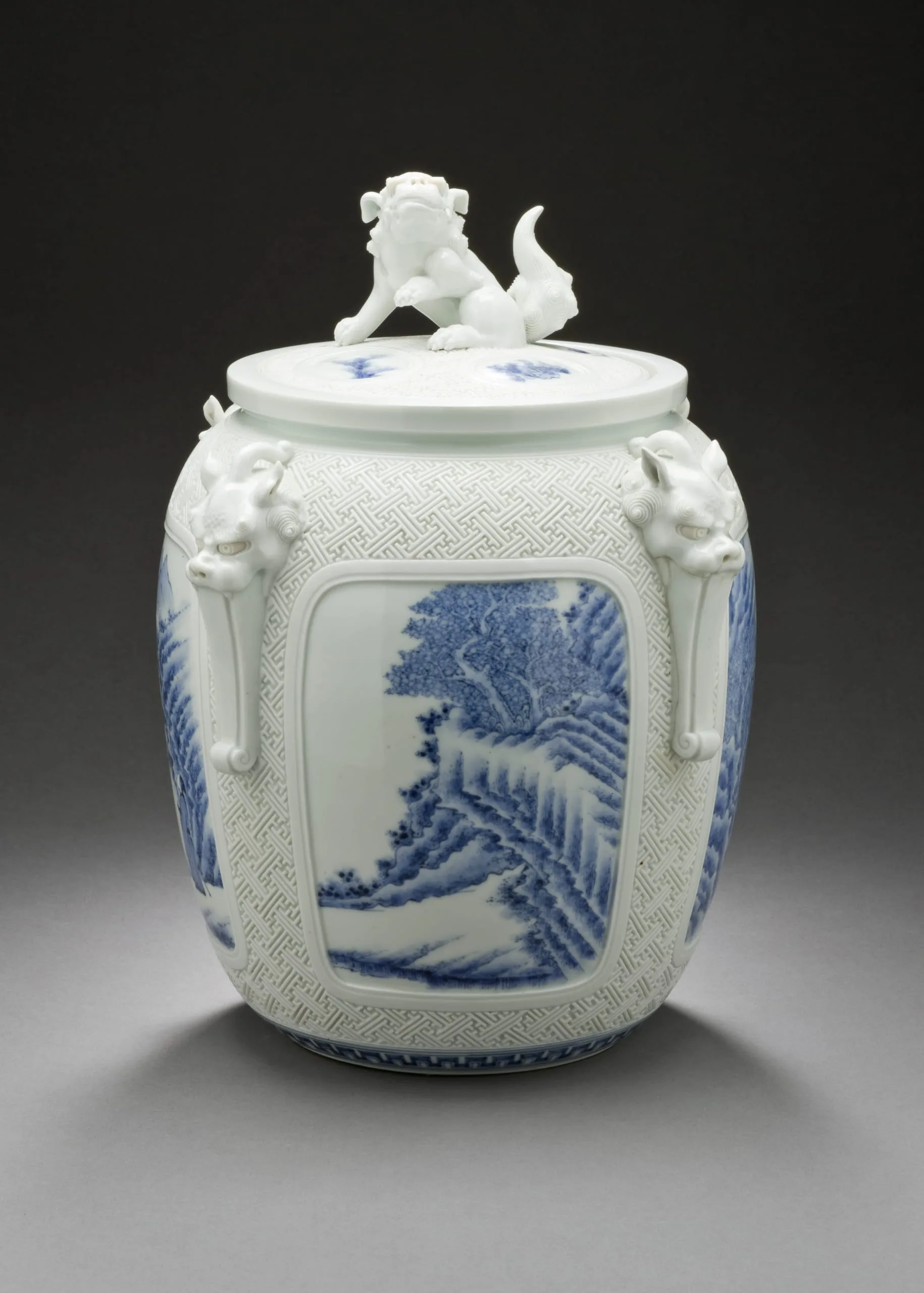 - Tea Ceremony Water Jar (Mizusashi) with Four Landscape Panels, Monster-mask Design