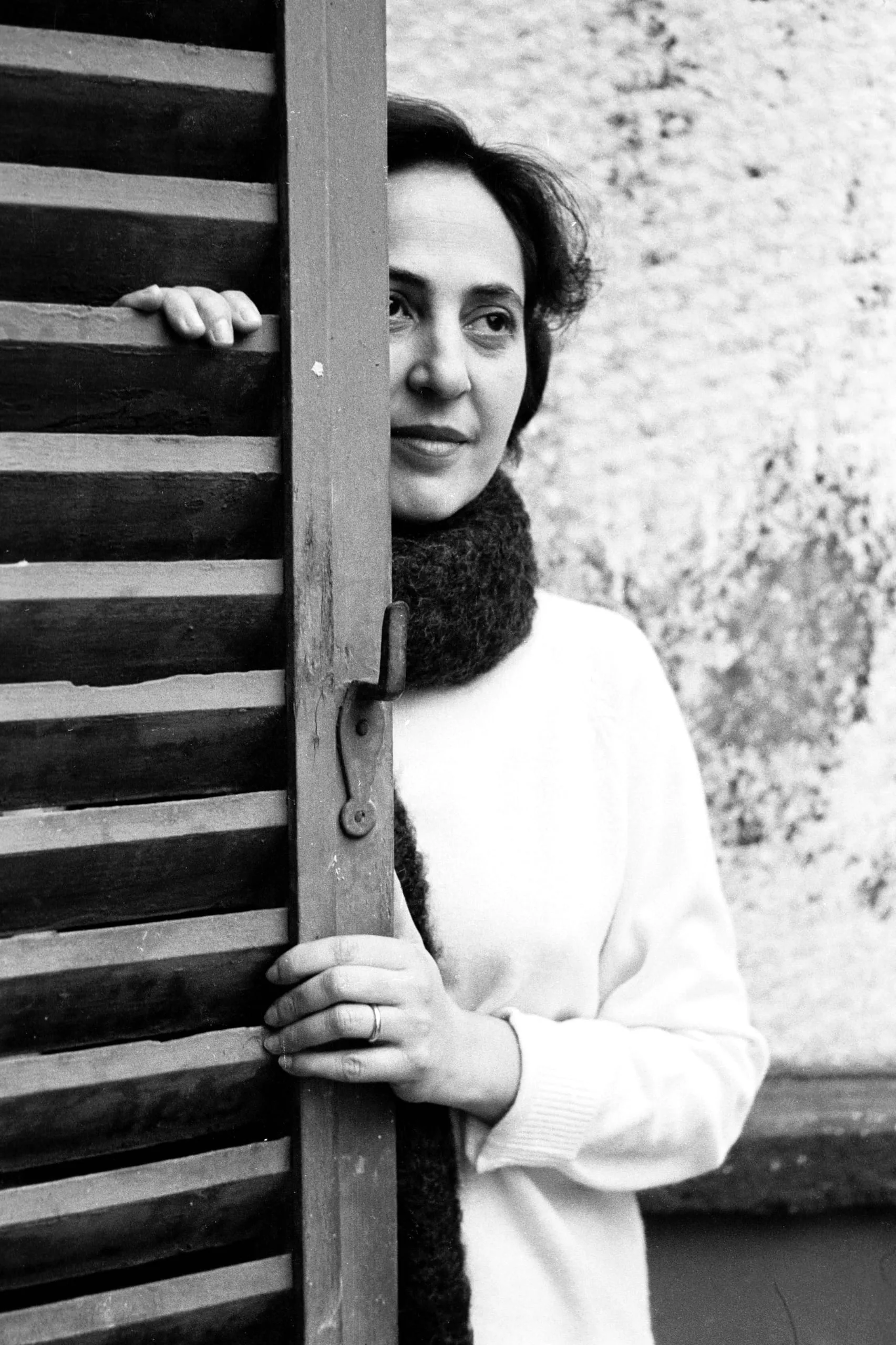 Black and white photograph of a woman in a white sweater and dark knit scarf peeking around the edge of a wooden louvered shutter, hands gripping the frame