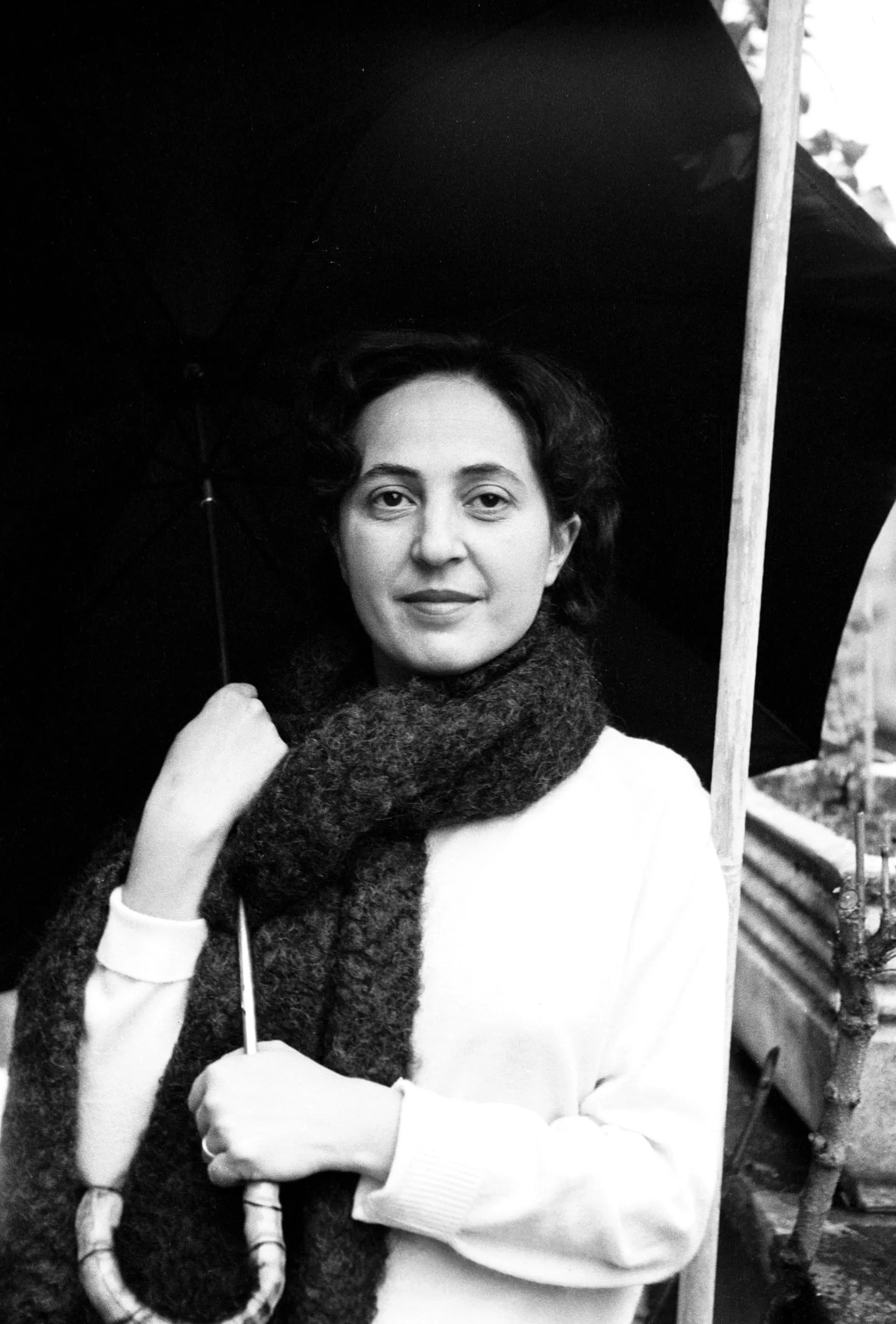 Black and white photograph, woman from the waist up holding an umbrella, wearing a white sweater and chunky knit scarf, looking directly at the camera outdoors