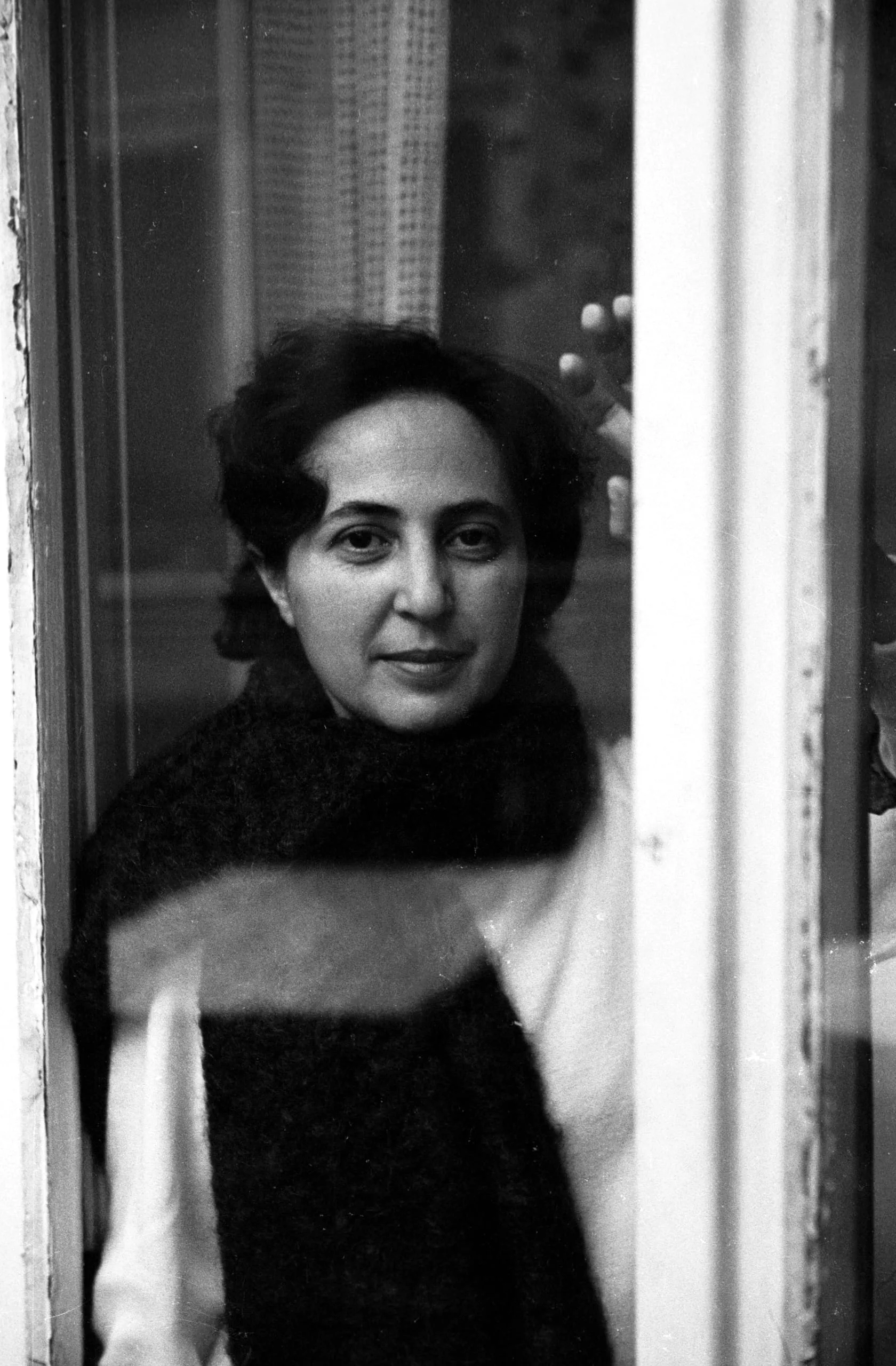 Black and white photograph of a dark-haired woman in a chunky dark wrap, photographed through a glass window pane with soft, diffused lighting