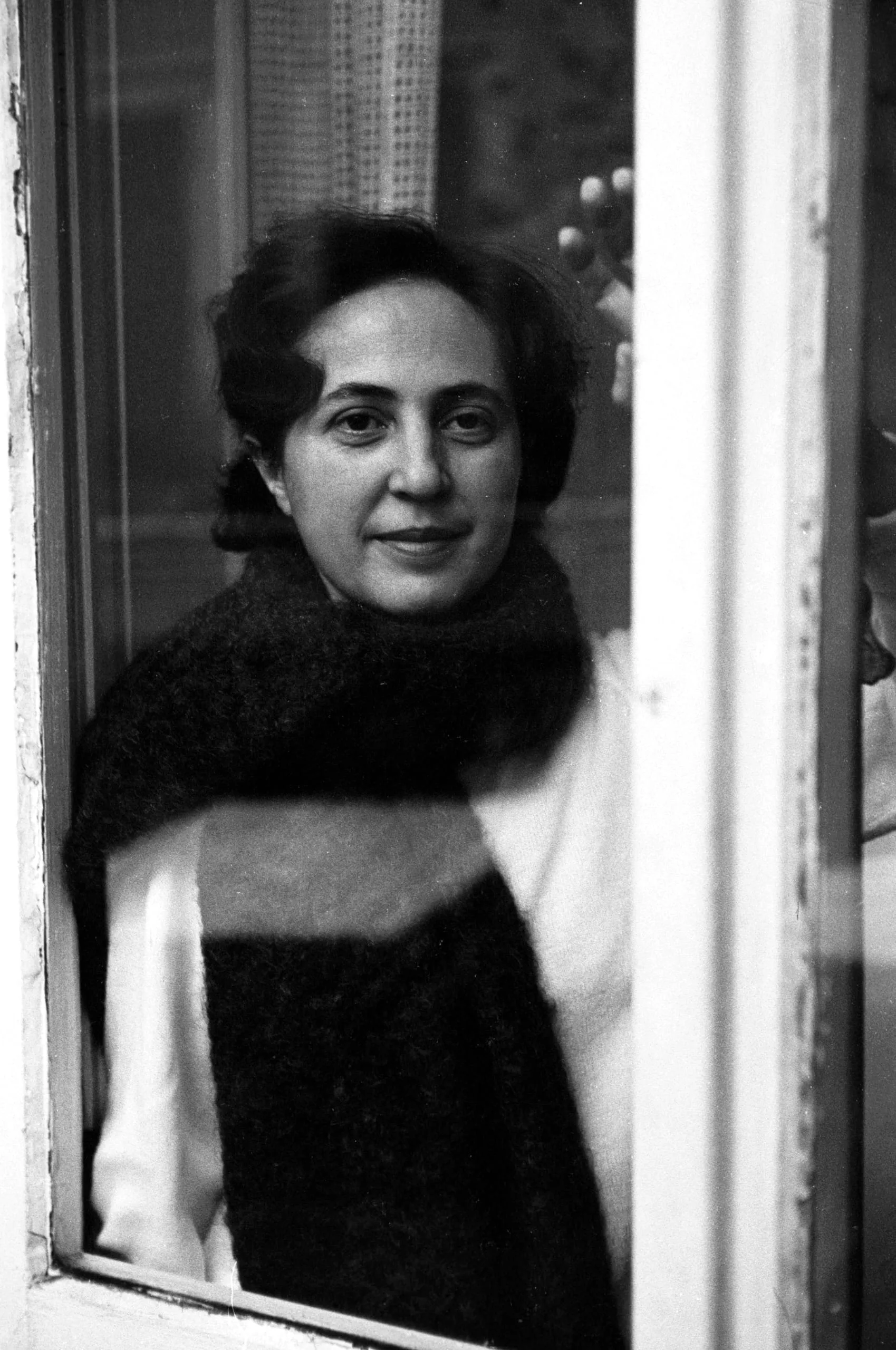 Black and white photograph of a woman seen through a glass window, wearing a dark wrap over a white top, soft diffused lighting