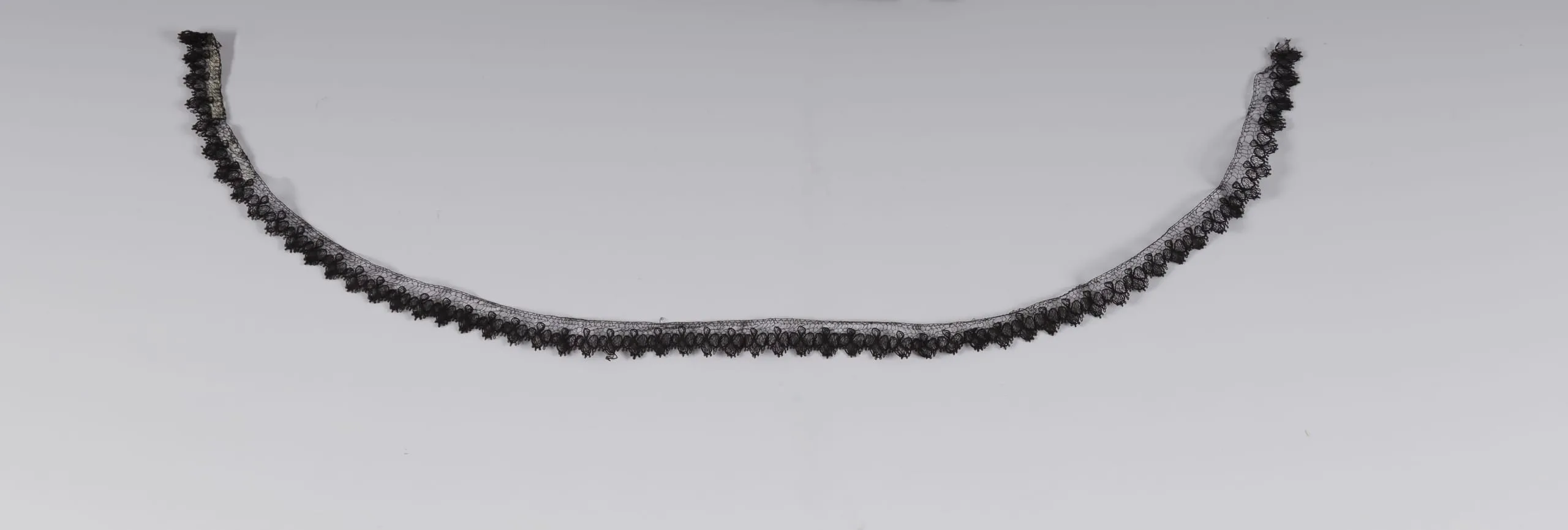 Black lace trim displayed flat in a wide U-shaped arc, with scalloped edges and small clustered bobbles along the lower border, against a pale gray background