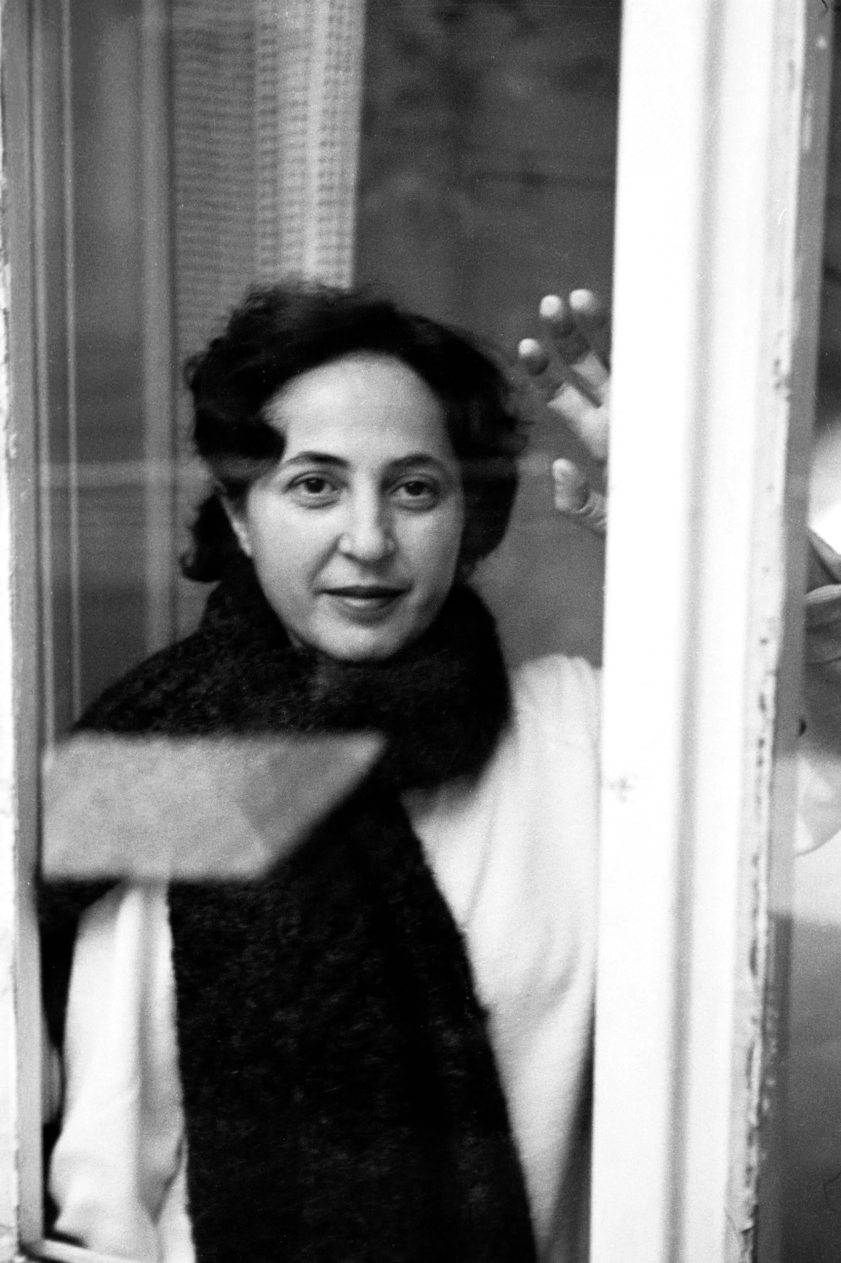 Black and white photograph of a dark-haired woman in a knit scarf seen through a glass window pane, looking directly at the camera