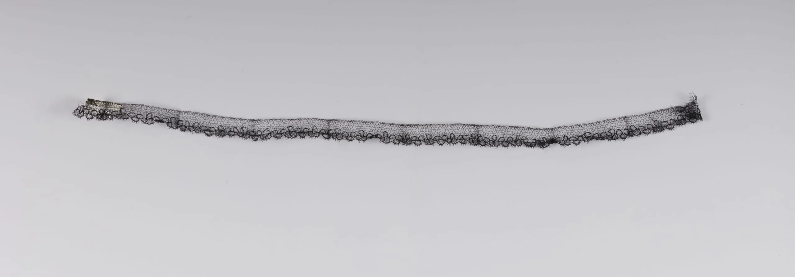 Long, narrow strip of black bobbin or needle lace with an open mesh ground and a continuous border of small floral motifs along the lower edge