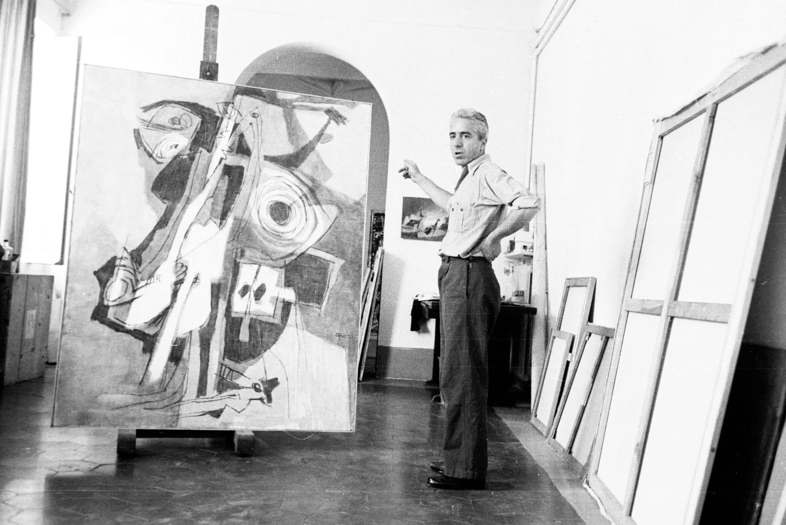 Black and white photograph of a man in a studio standing beside a large abstract painting on an easel, right arm raised, several blank canvases leaning against the wall behind him