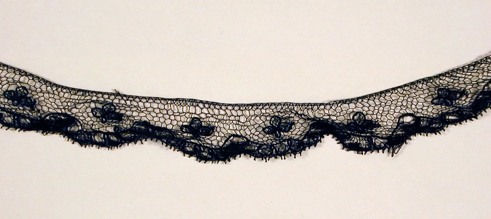 Narrow strip of black lace trim with hexagonal net ground and raised floral motifs, scalloped lower edge, draped in a gentle arc against a white background