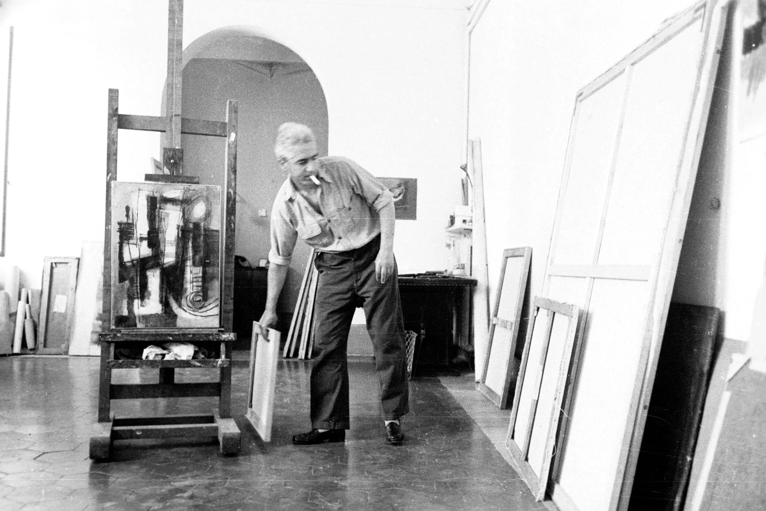 Black and white photograph of a man in a short-sleeved shirt and dark trousers leaning toward a wooden easel holding an abstract painting, in an artist's studio