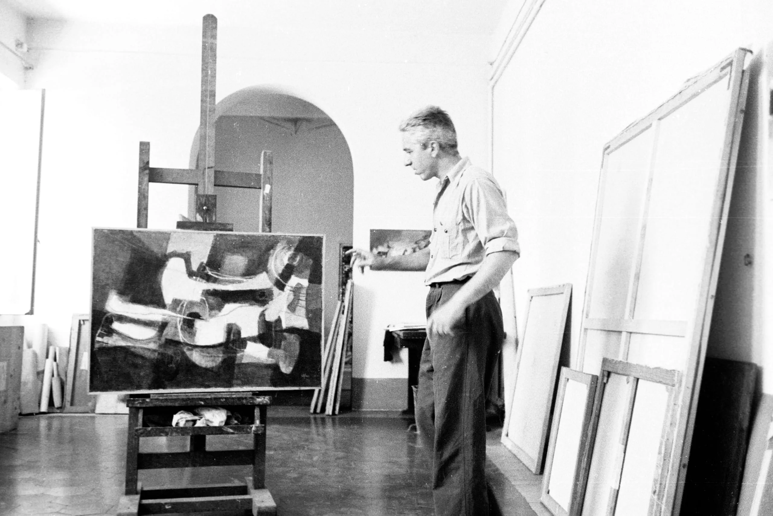Black and white photograph of a man in a studio examining an abstract painting on a low easel, surrounded by stacked canvases