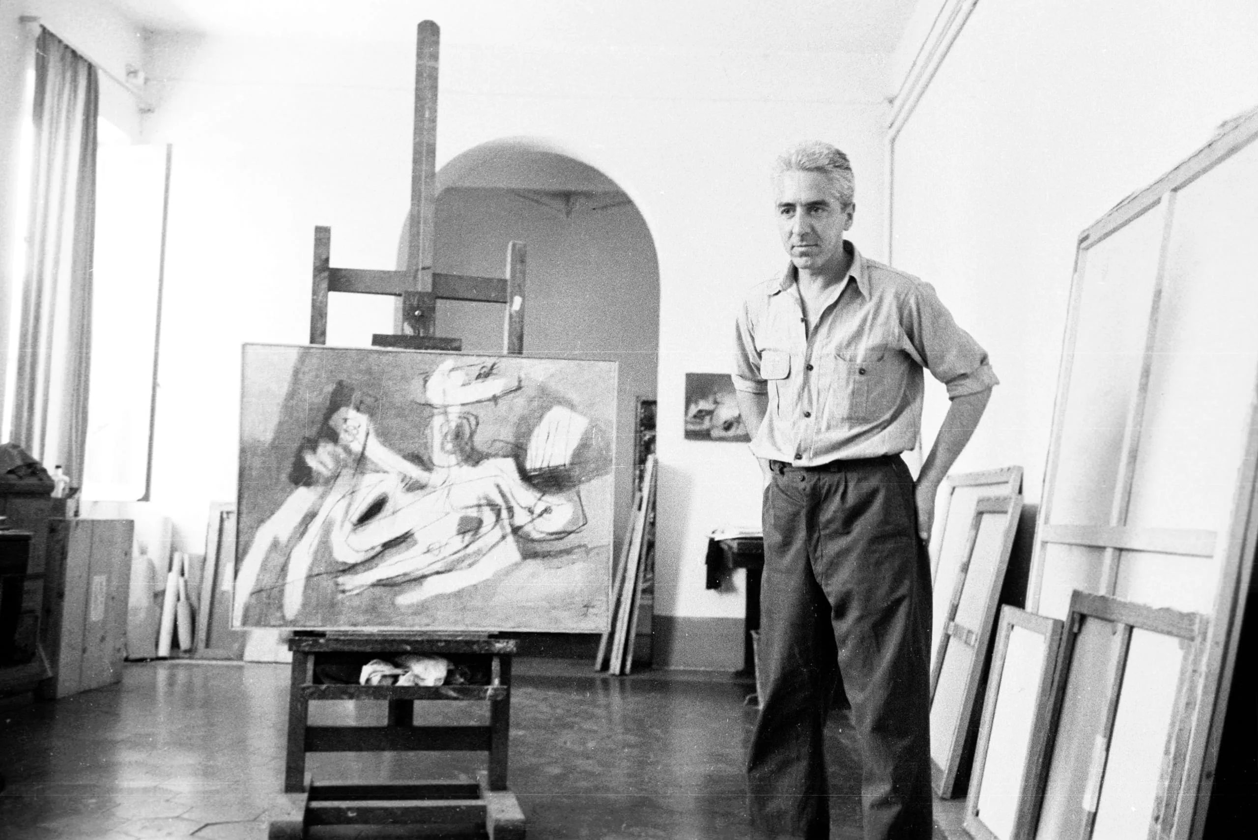Black and white photograph of a man in a collared shirt and dark trousers standing beside a large semi-abstract painting on an easel in an artist's studio