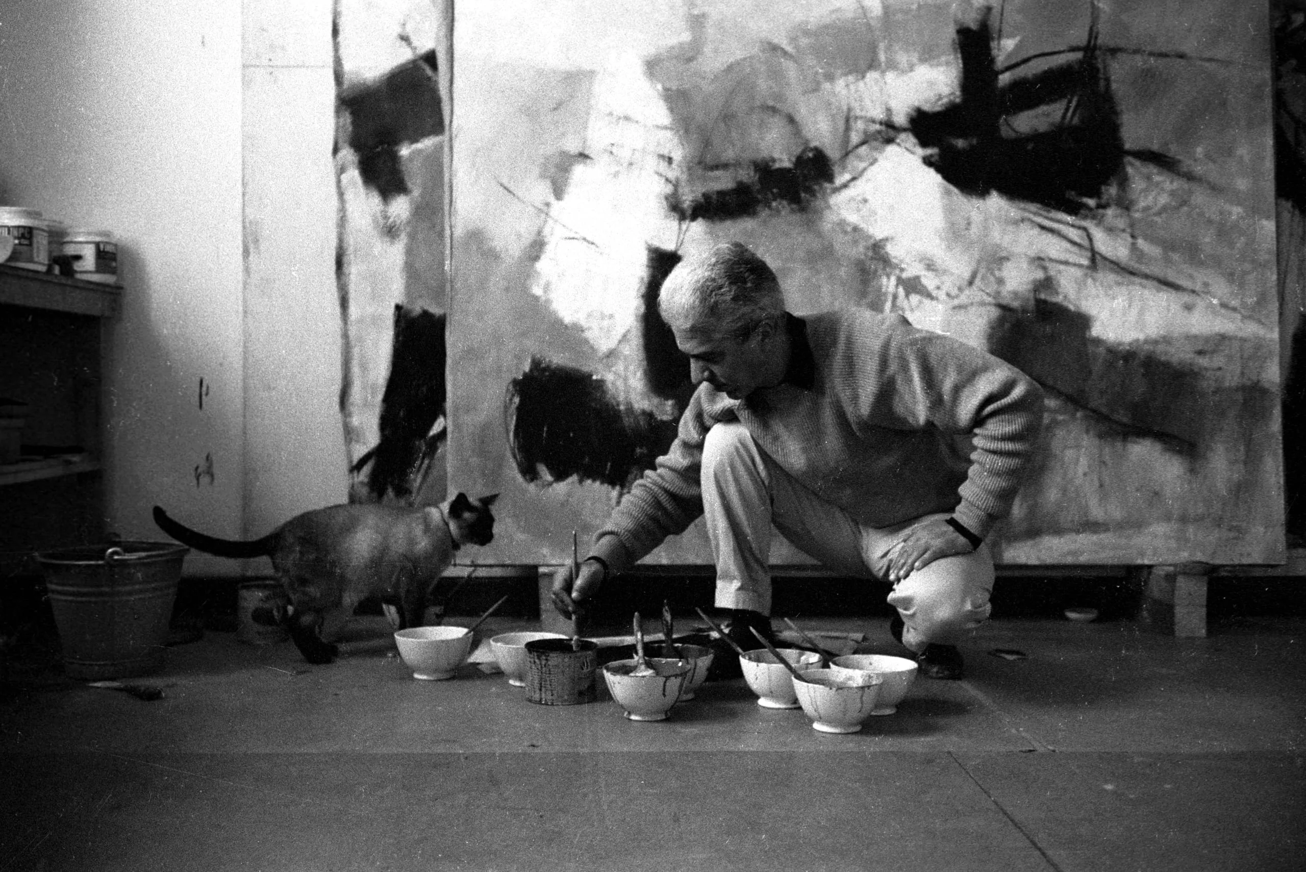 Black and white photograph of a man crouched on a studio floor, dipping a brush into one of several small white bowls, a large abstract canvas behind him and a dark cat nearby