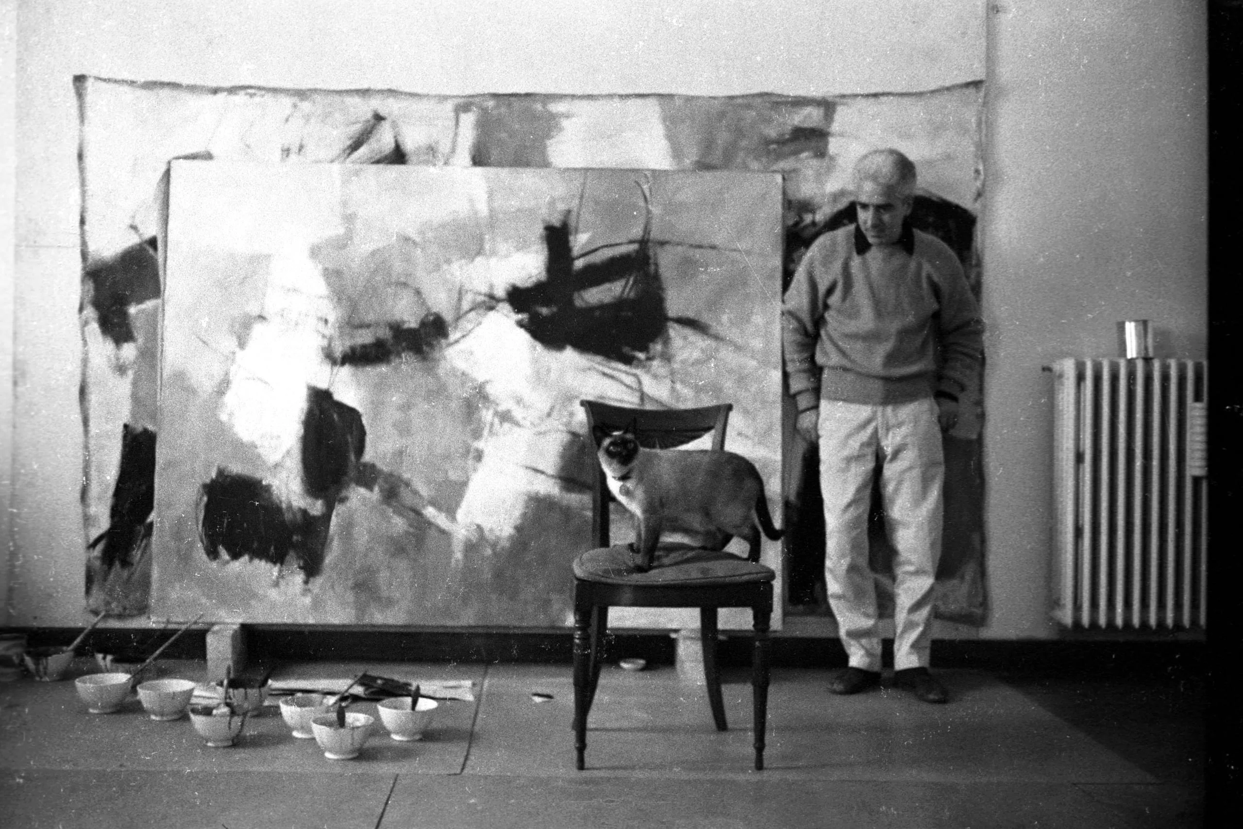 Black and white photograph of a man standing beside a chair with a Siamese cat in an artist's studio, a large abstract painting leaning against the wall behind them