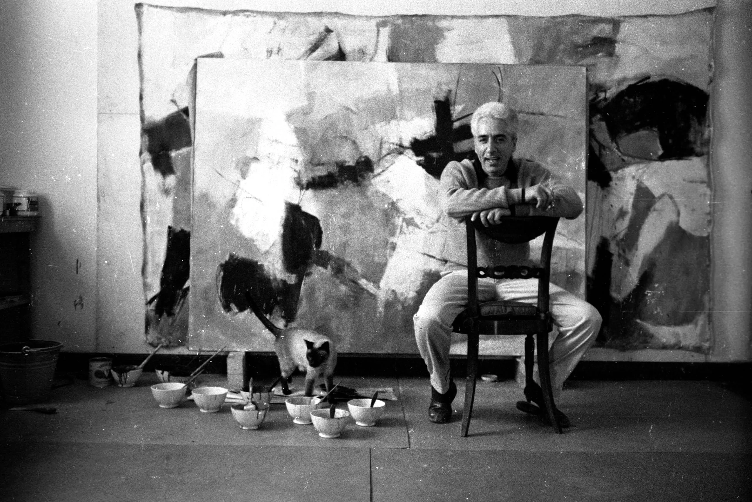 Black and white photograph of a man with light hair seated in a wooden chair in an artist's studio, leaning on the chair back, with a Siamese cat and a row of small bowls on the floor beside him, and large abstract paintings propped against the wall behind