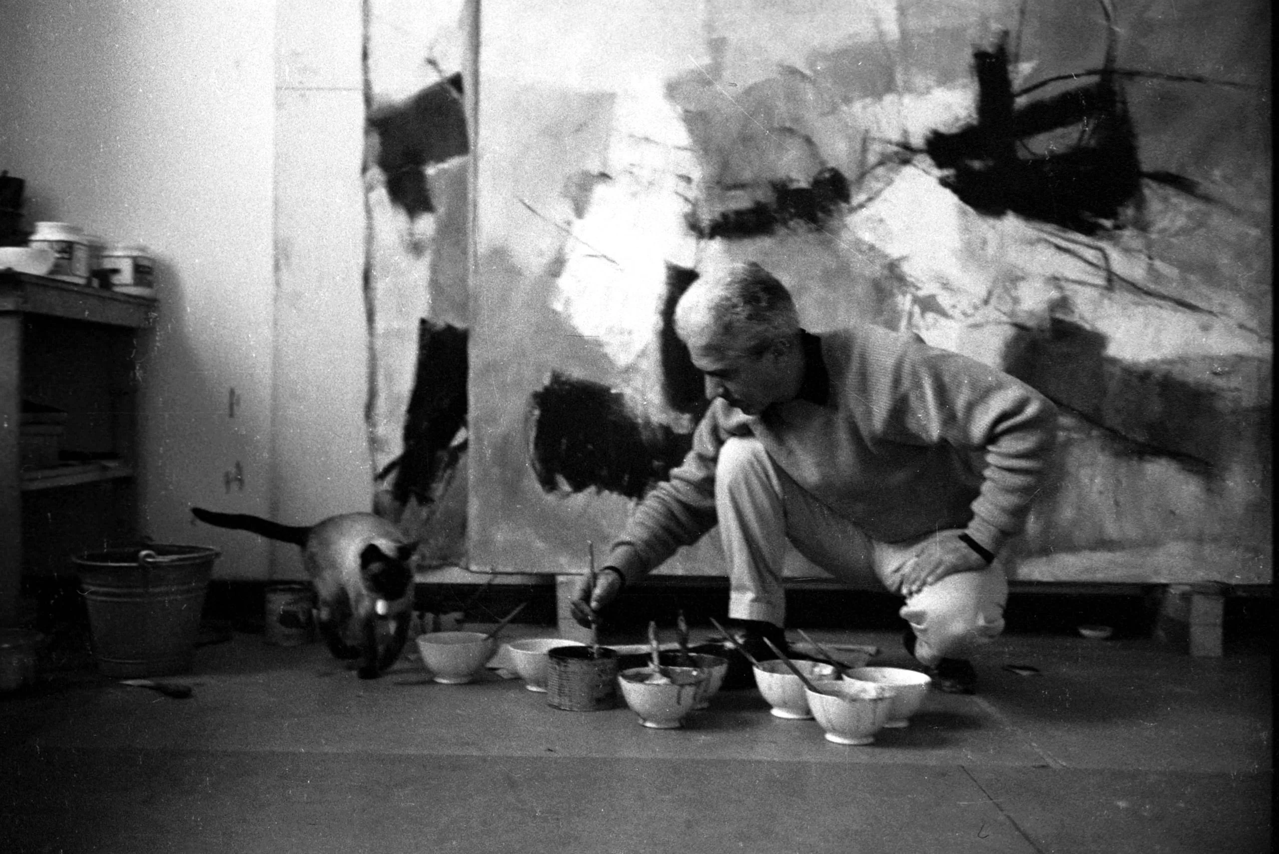 Black and white photograph of a man crouching on a studio floor over a row of paint bowls, a Siamese cat nearby, a large abstract painting behind him