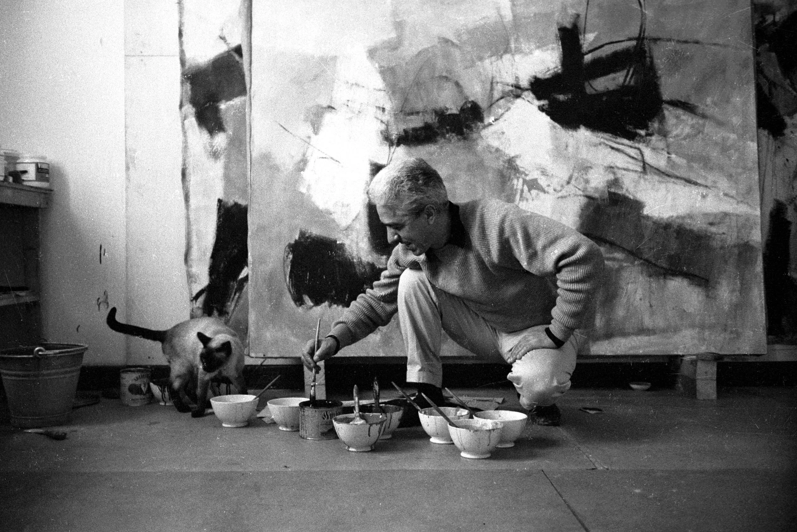 Black and white photograph of a man crouching on a studio floor, dipping a brush into one of several bowls in a row, with large abstract paintings on canvases behind him and a Siamese cat nearby
