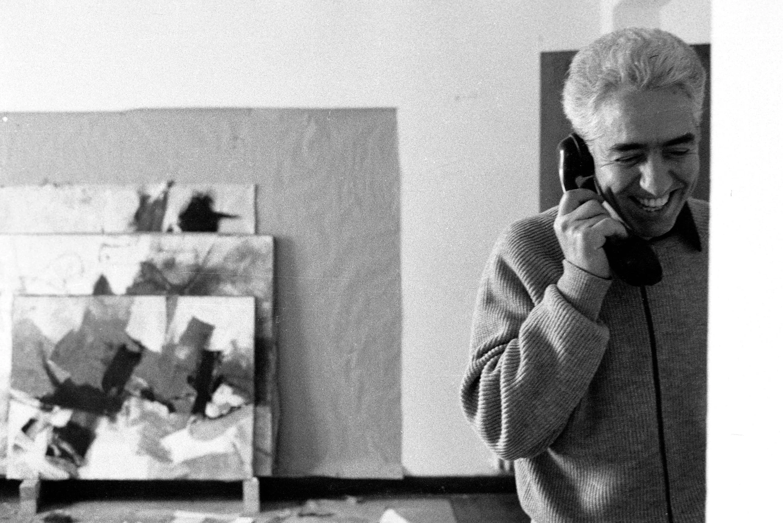Black and white photograph of a white-haired man in a ribbed sweater, smiling while holding a telephone handset, with abstract paintings leaning against the wall behind him