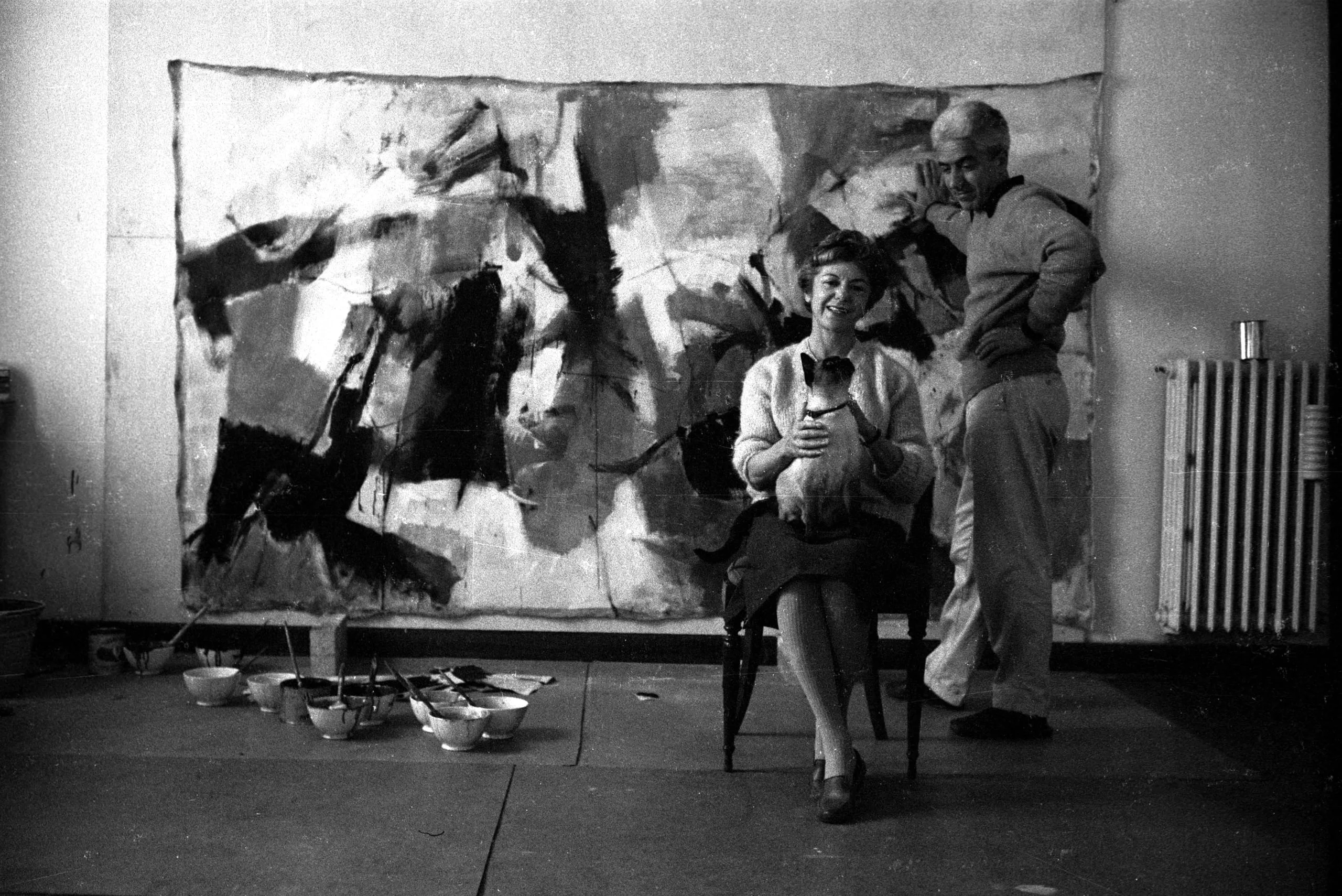 Black and white photograph of a smiling woman seated in a chair and a man standing behind her in an artist's studio, a large abstract expressionist painting on the wall behind them