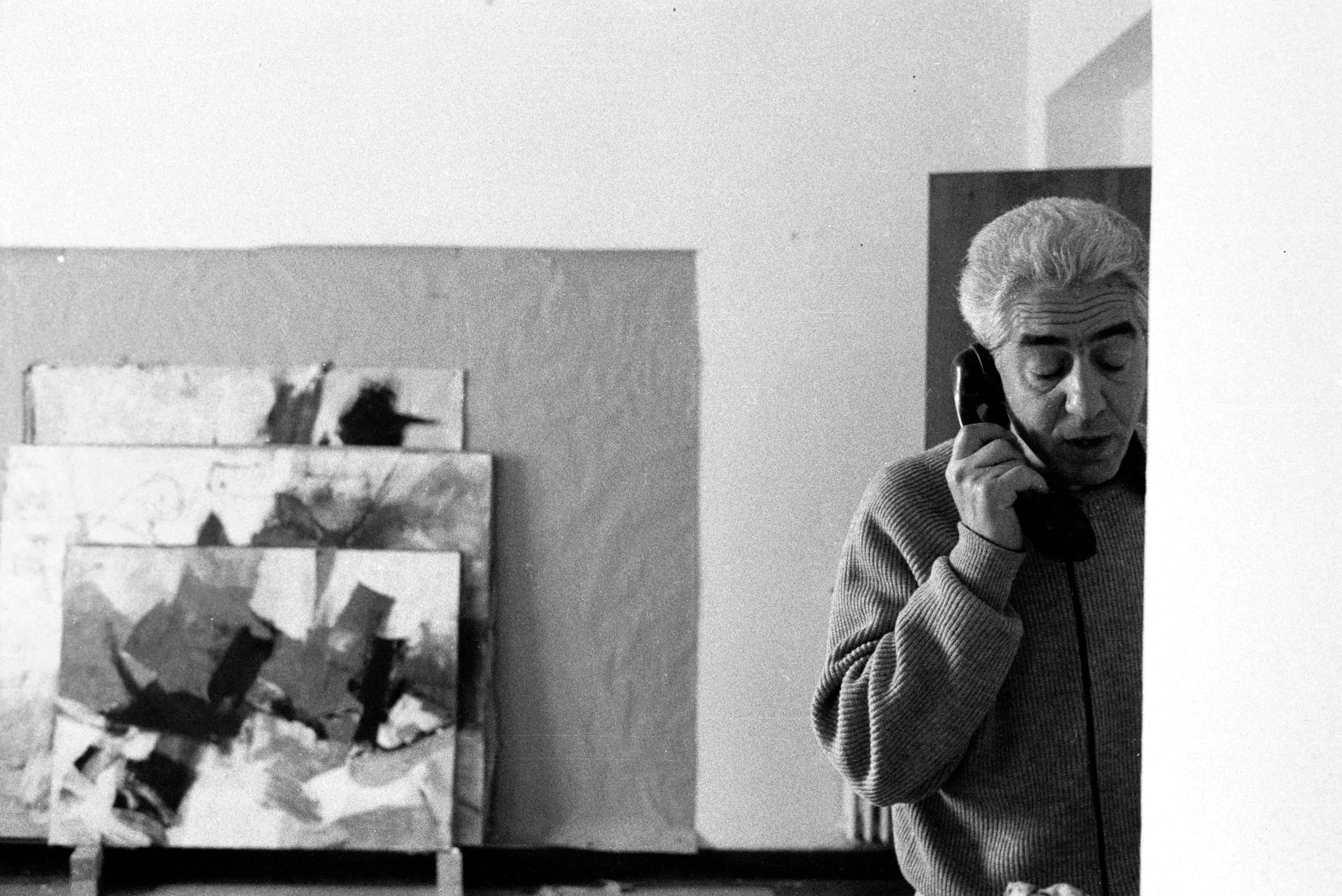Black and white photograph of a gray-haired man in a knit sweater holding a telephone to his ear, with abstract paintings leaning against a wall behind him
