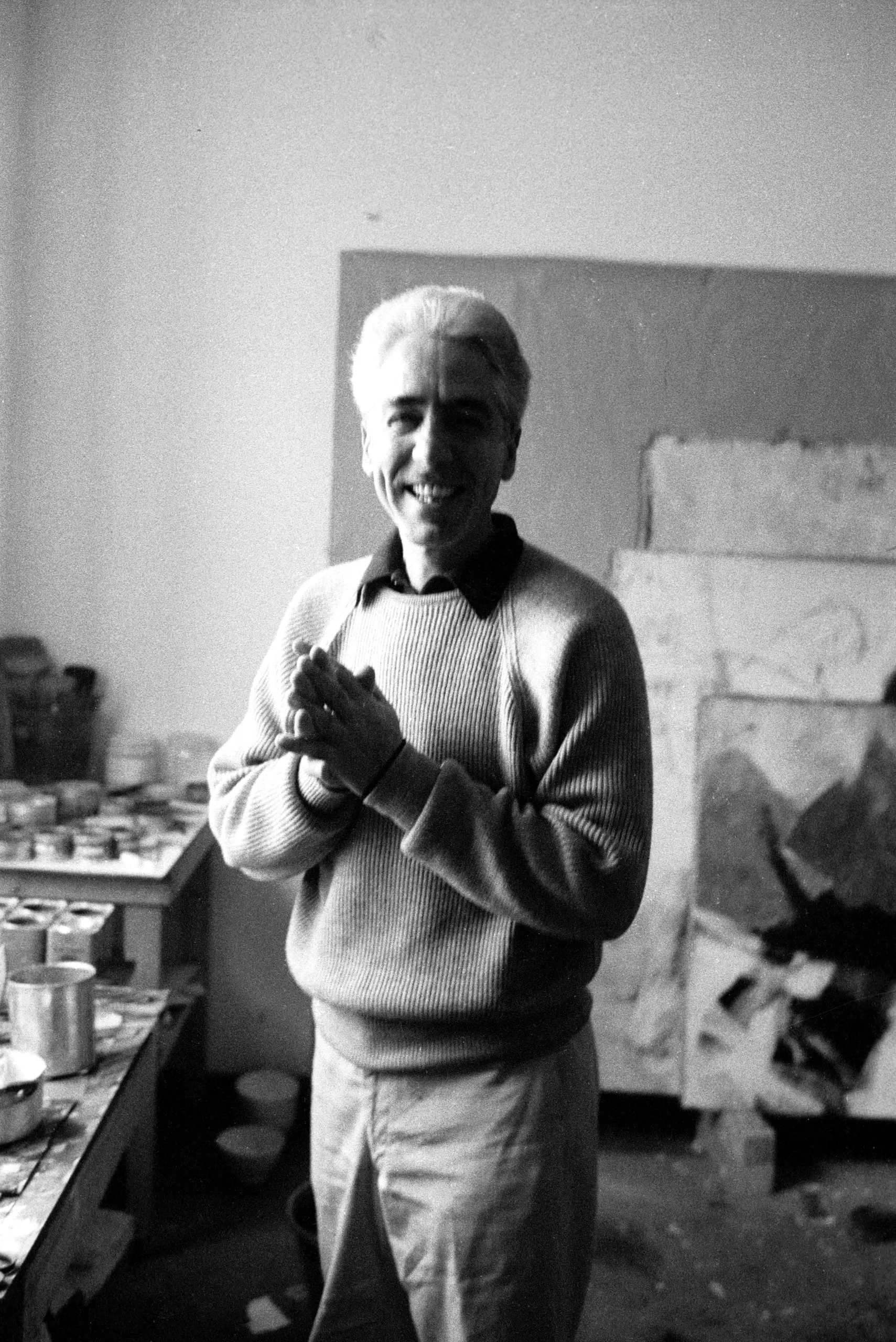 Black and white photograph of a white-haired man in a ribbed sweater standing in an artist's studio, hands clasped, smiling broadly