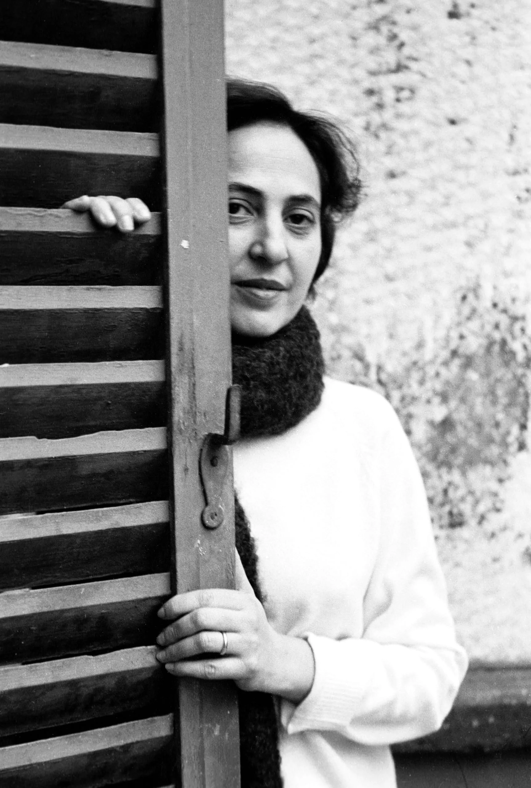 Black and white photograph of a woman peeking around the edge of a wooden louvered shutter, wearing a white sweater and dark textured scarf