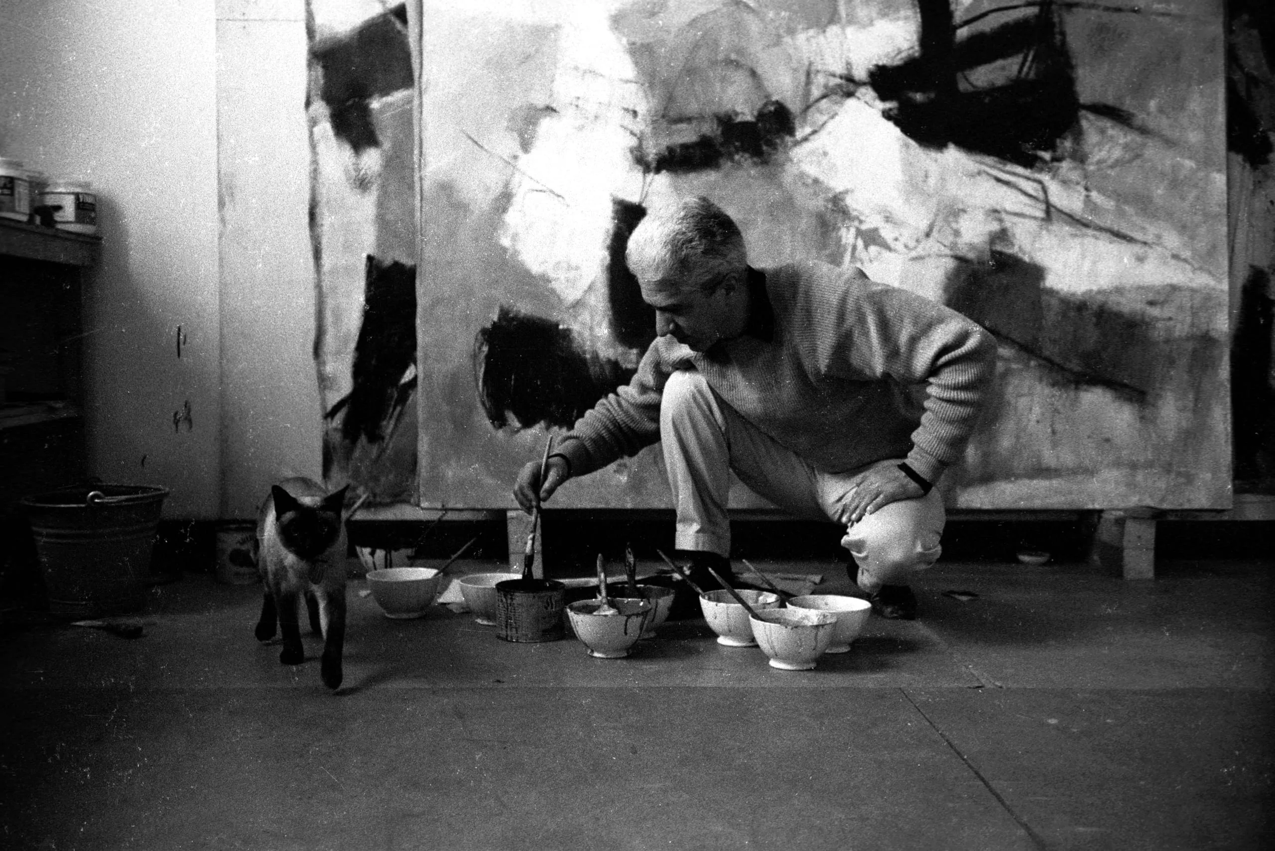 Black and white photograph of a man crouching on a studio floor, dipping a brush into bowls of paint, with large abstract canvases behind him and a Siamese cat to his left