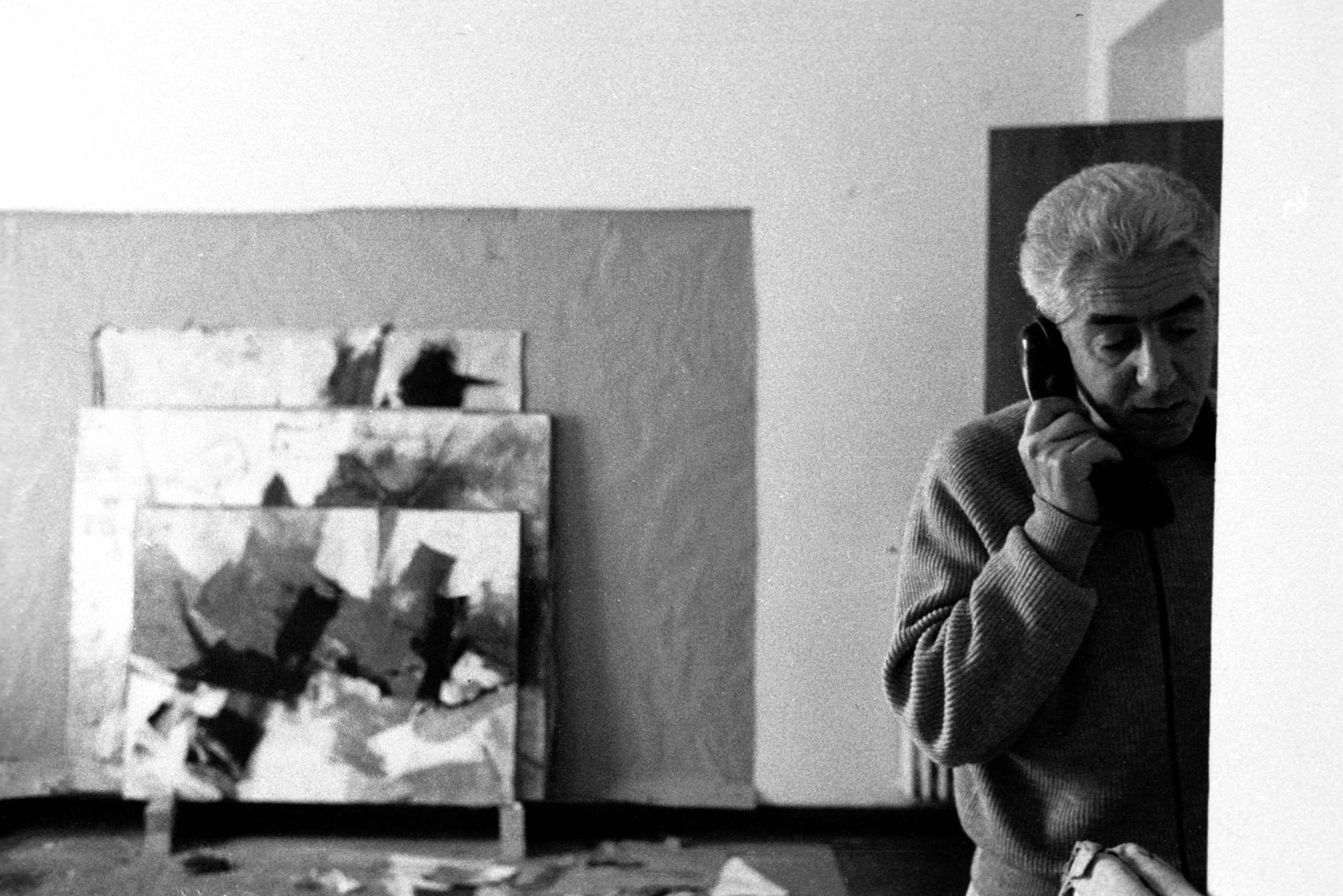 Black and white photograph of a gray-haired man in a ribbed sweater talking on a telephone handset, with abstract paintings leaning against a studio wall behind him
