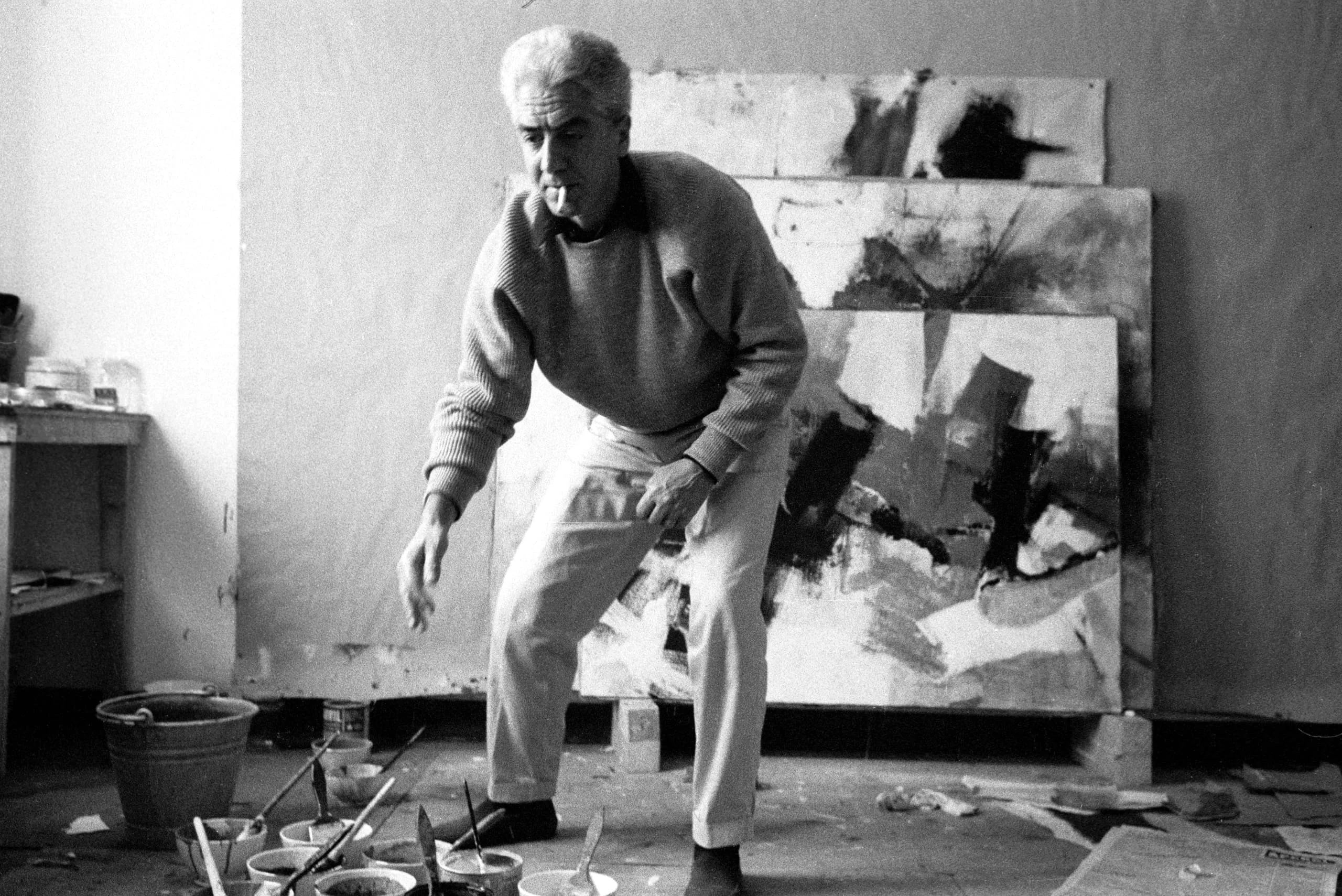 Black and white photograph of a gray-haired man in a knit sweater bending forward in an artist's studio, with large abstract canvases leaning against the wall behind him