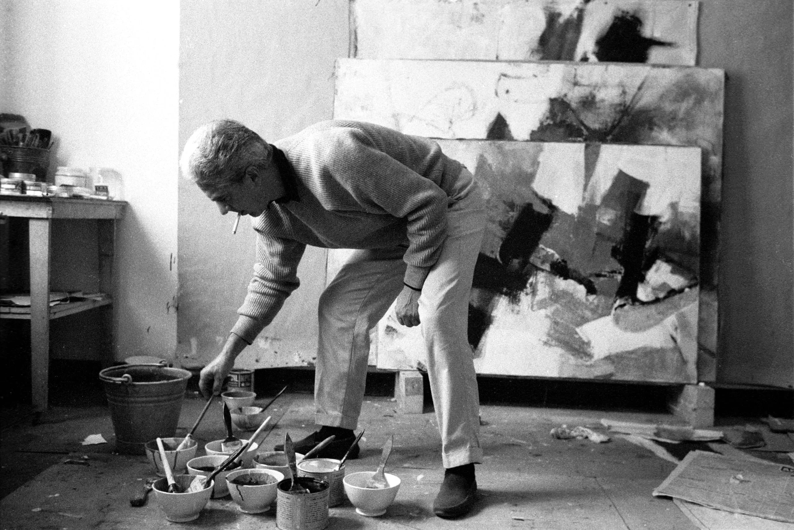Black and white photograph of a man bending over paint-filled bowls on a studio floor, with large abstract canvases leaning against the wall behind him