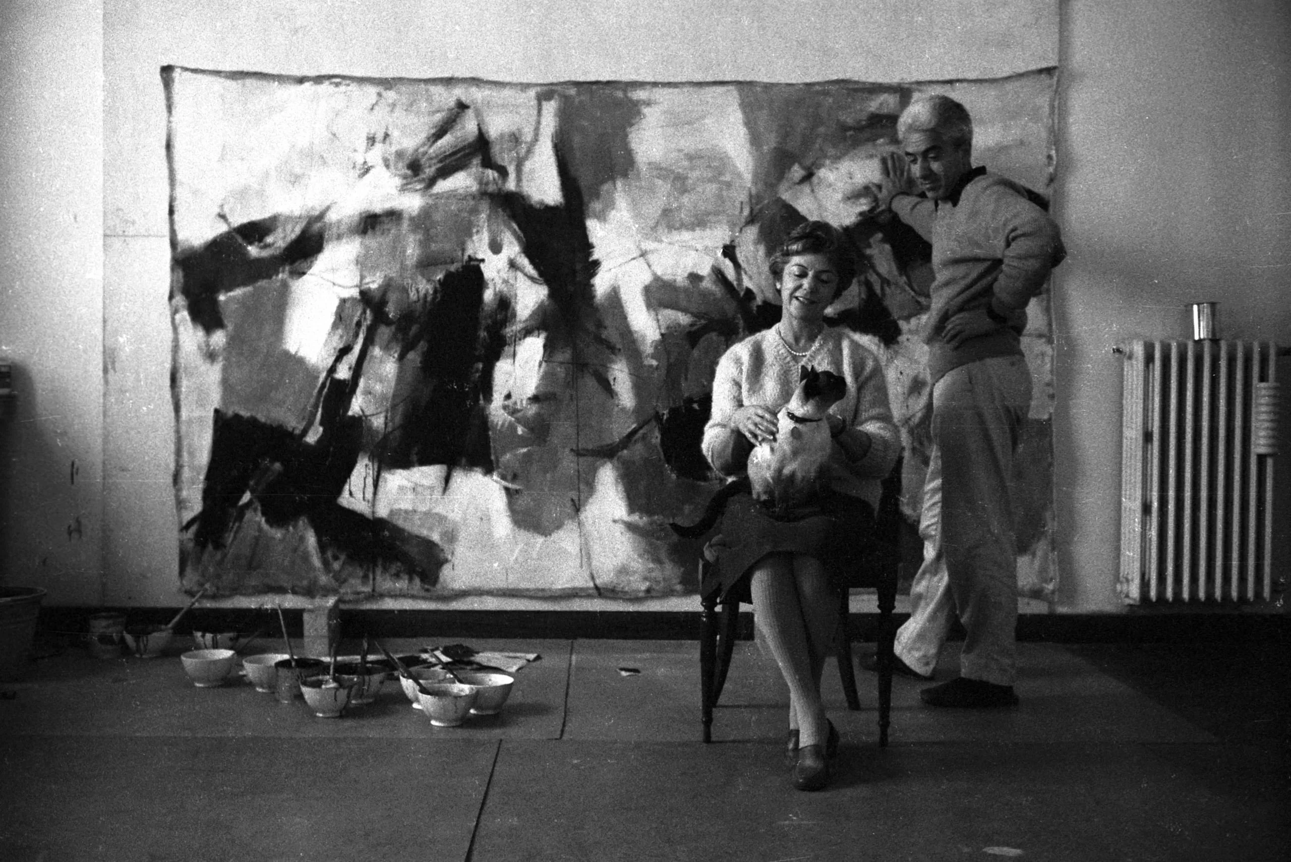 Black and white photograph of a smiling woman seated holding a cat and a standing man in an artist's studio, a large gestural abstract painting behind them