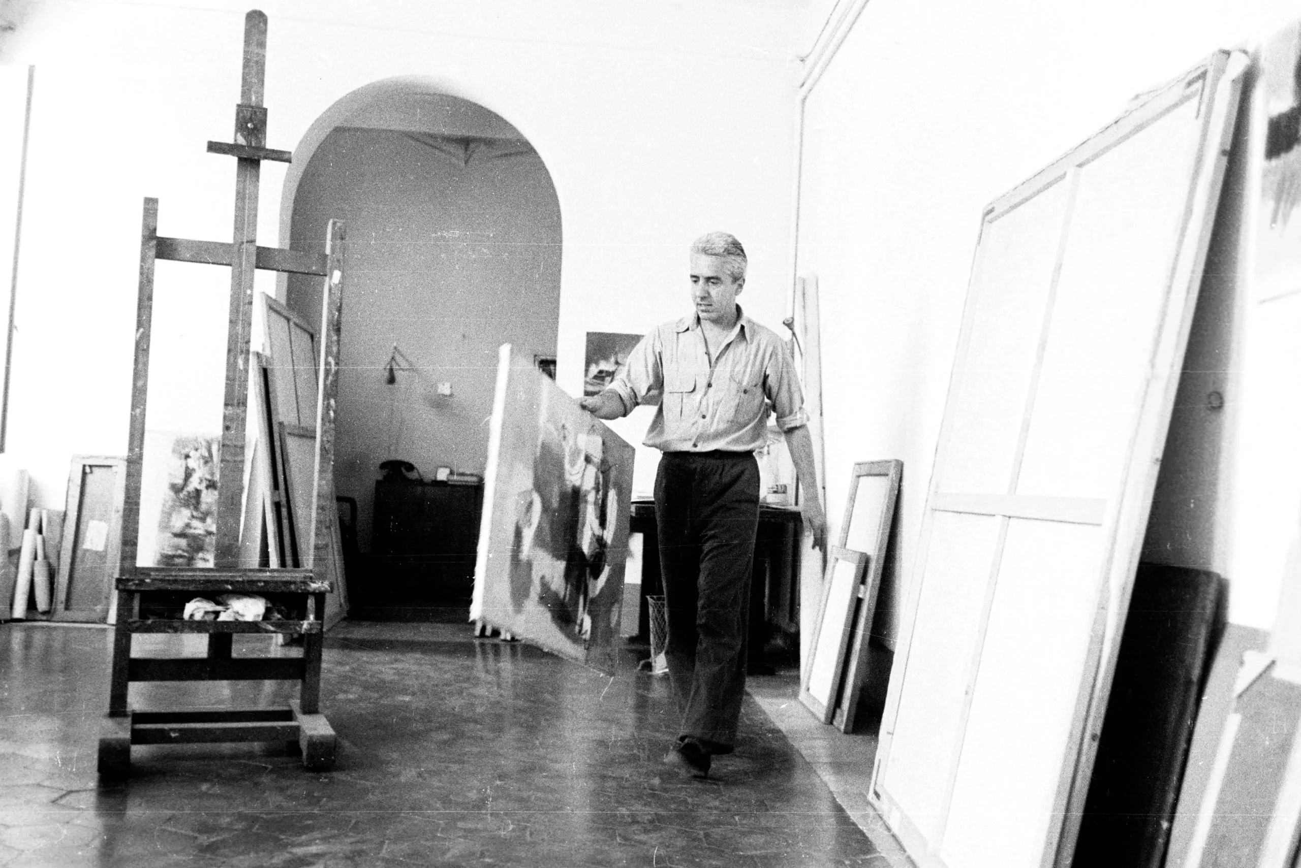 Black and white photograph of a man in a button-down shirt and dark trousers carrying a large canvas through a white-walled artist's studio with easels and canvases