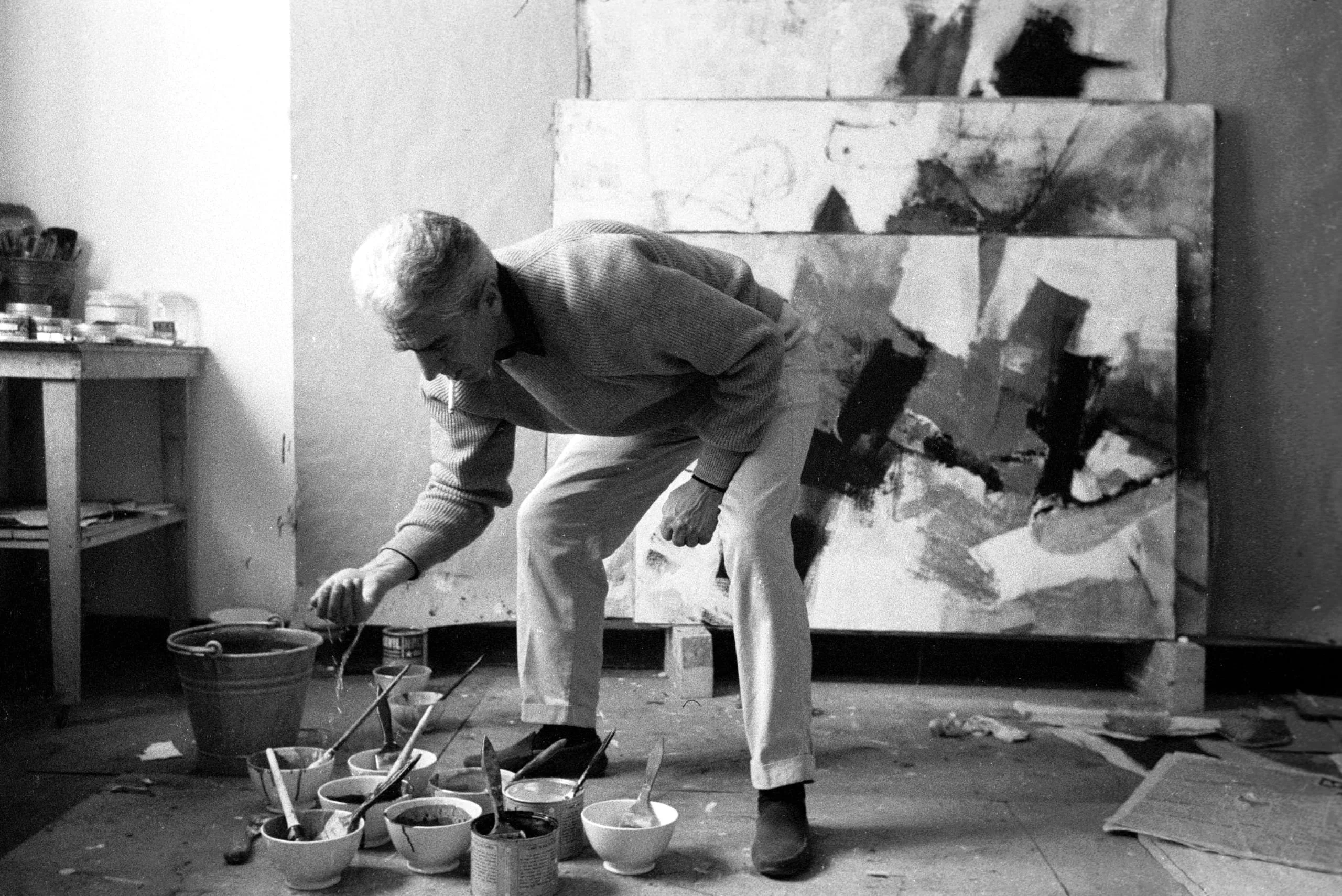 Black and white photograph of a white-haired man bending over paint cans and brushes on a studio floor, with large abstract canvases leaning against the wall behind him