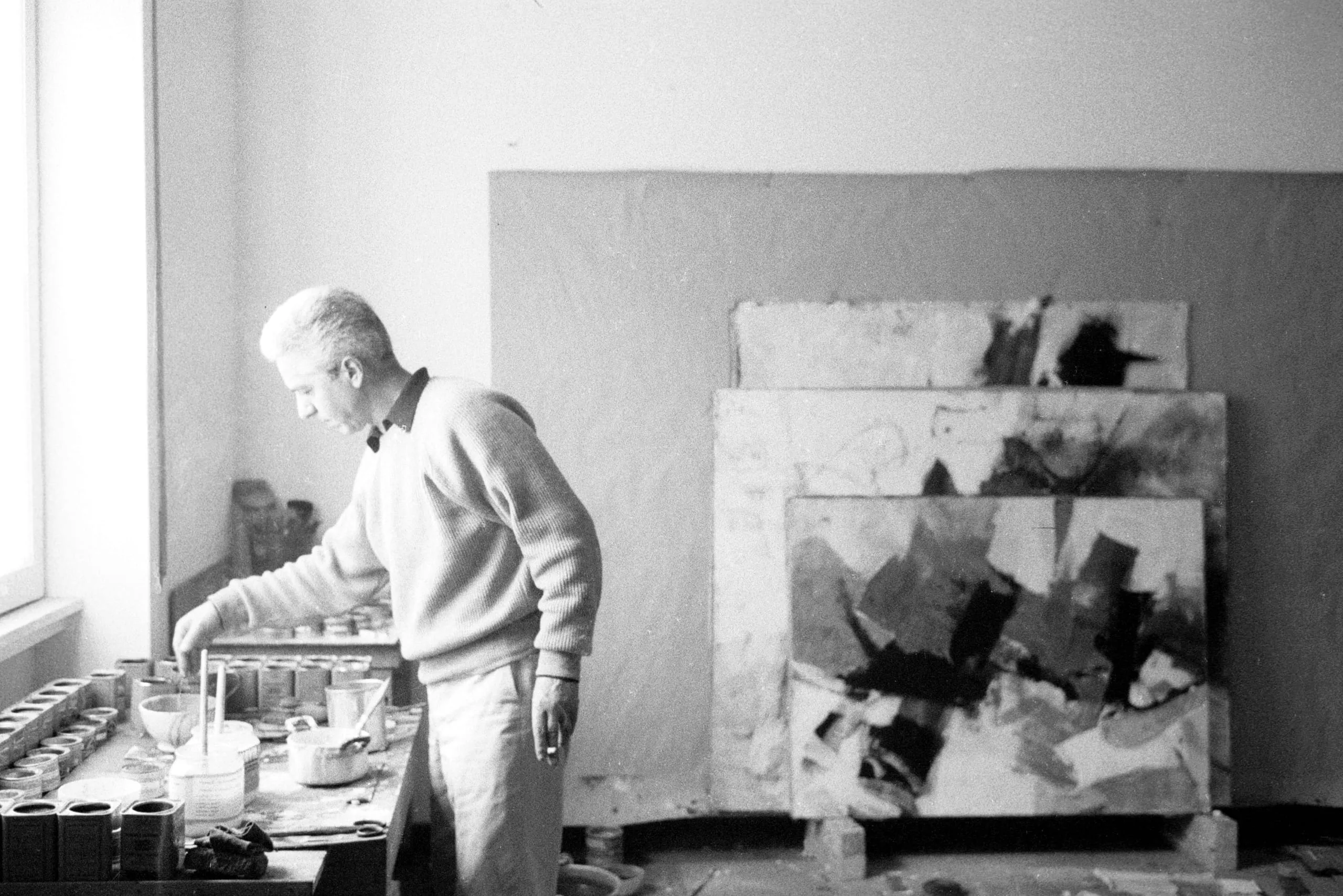 Black and white photograph of a man in a light sweater standing in profile at a paint-covered worktable in a studio, with two large abstract canvases leaning against the wall behind him