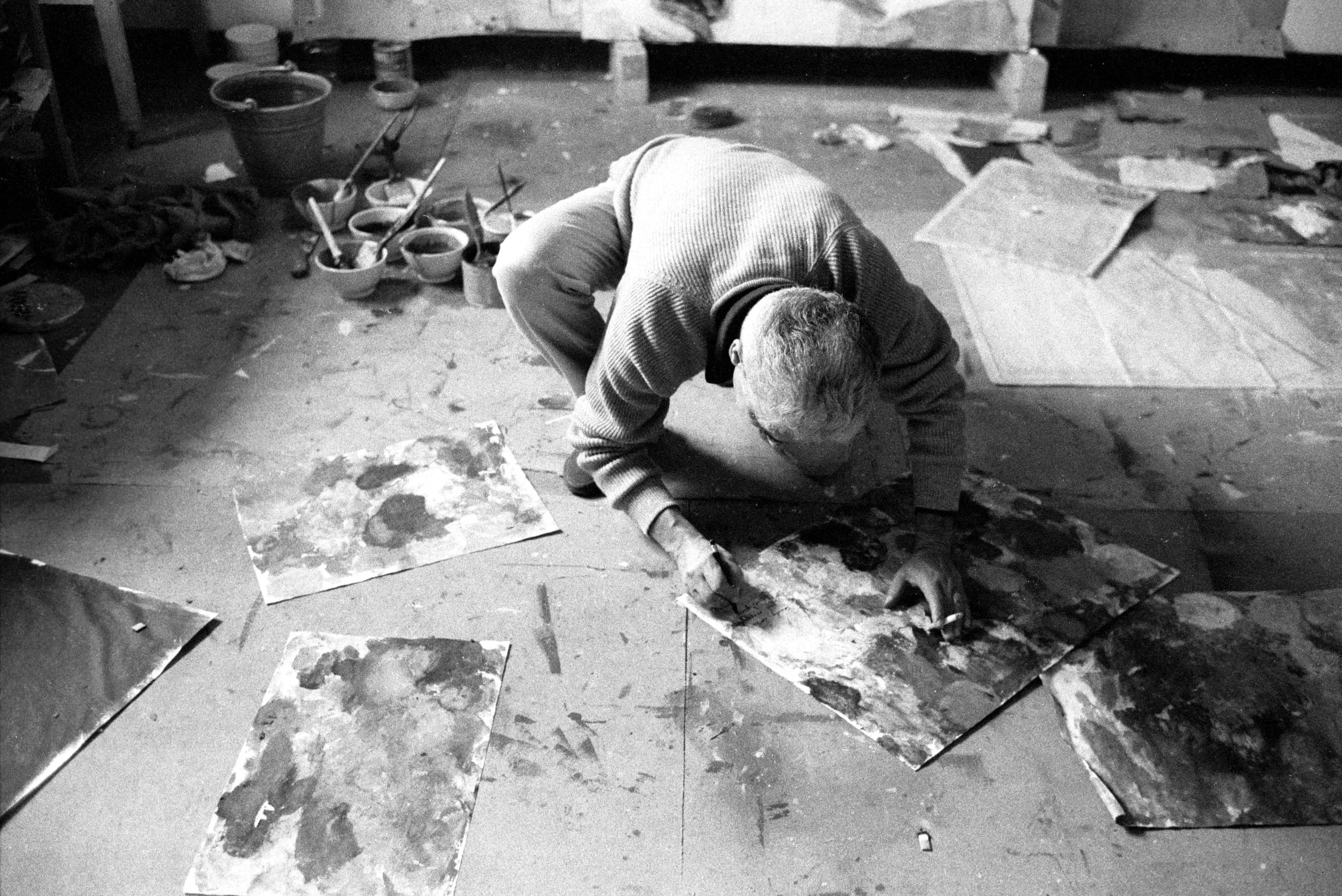 Black and white photograph of a man crouched over a paint-stained studio floor, working on abstract sheets of paper surrounded by brushes and paint containers